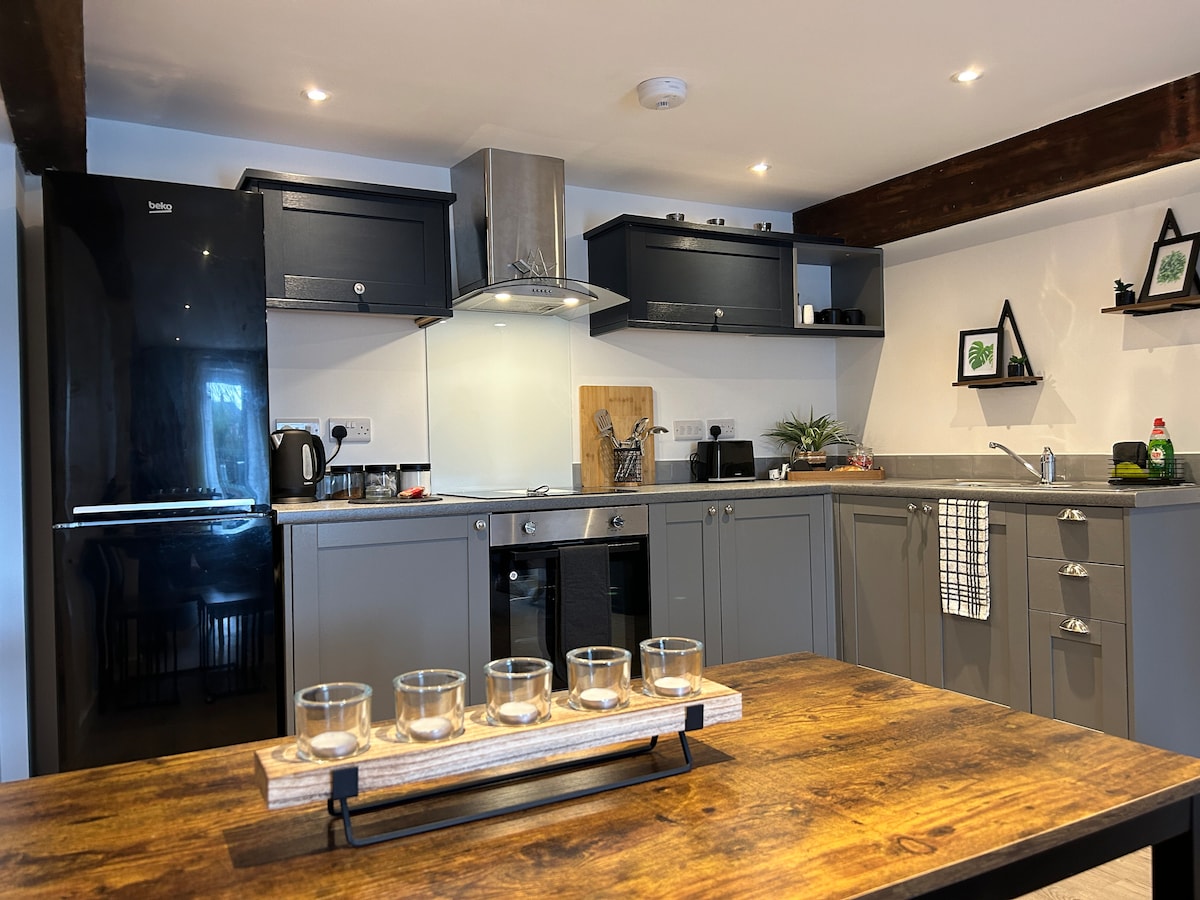 Tire uma folga e relaxe neste espaço rural calmo e elegante. Desfrute de passar um tempo no ambiente de luxo, cercado por terras agrícolas e belas vistas com as comodidades da sua casa. Aprecie as vistas da sua cama super king, da grande banheira independente ou da varanda Juliet. Relaxe na grande área de estar assistindo seus filmes favoritos na TV inteligente de 75 polegadas, WIFI e som surround. Você tem uma cozinha que está equipada com fogão elétrico ventilador e 2 fogões para cozinhar suas refeições e uma mesa de jantar para comê-las.