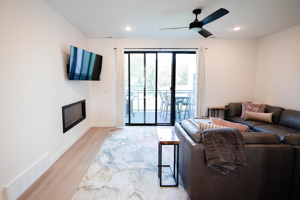 Enjoy a stylish experience at this centrally-located place. This is a completely overhauled 3 bedroom, 2 bath, apartment with ability to be 2 separate units with lock out feature. West Lake is across the street with 5 public access dock spaces available to swim from. Close to Abbie Gardner Park and walking distance to the amusement park, mini golf, restaurants, shopping, Green Space concerts, fireworks and downtown entertainment. On site parking. Quiet neighborhood. External work in progress.