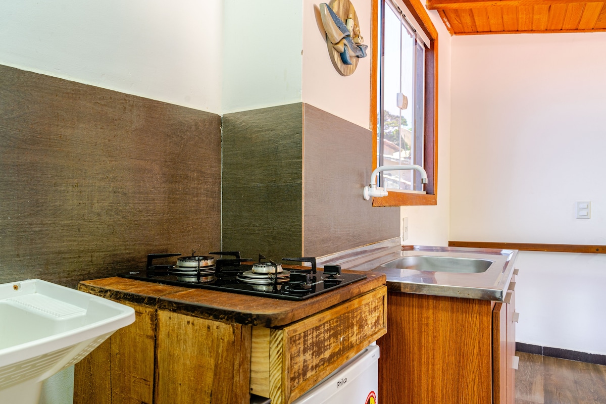 Flat com cozinha e banheiro privativos (só voces usam) com internet, TV 32'' , roupa de cama inclusa, localizado a duas quadras da praia, com ventilador de teto e ventilador de mesa 40 cm., Cooler que pode ser usado levando suas bebidas para praia, possui uma pequena varanda e rede de descanso, equipado com ferro elétrico, cafeteira, microondas e secador de cabelo Para acessar o Flat necessário subir uma alameda de uns 20 metros..