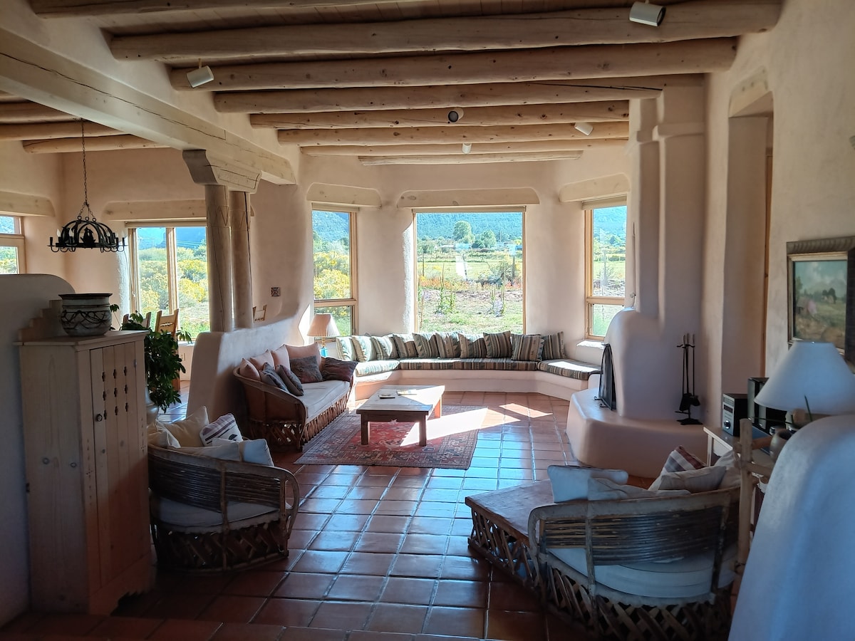 O artista Rod Goebel criou este santuário pacífico - uma residência, capela, pátio com tela e casa de hóspedes, numa deslumbrante beleza de seis acres, retiro rural totalmente vedado. Desfrute de um pátio coberto, grelhador, banheira de hidromassagem e cozinha parcial com todos os equipamentos essenciais. Apenas a 12 minutos da cidade, perto da estrada Taos Ski Valley. A nossa propriedade, que aceita animais de estimação, é sagrada e privada, foi nomeada a melhor Airbnb em Taos para 2025 - "Apenas no Novo México" online. Venha descontrair com arte, o esplendor da natureza e o verdadeiro relaxamento, sob o céu estrelado.