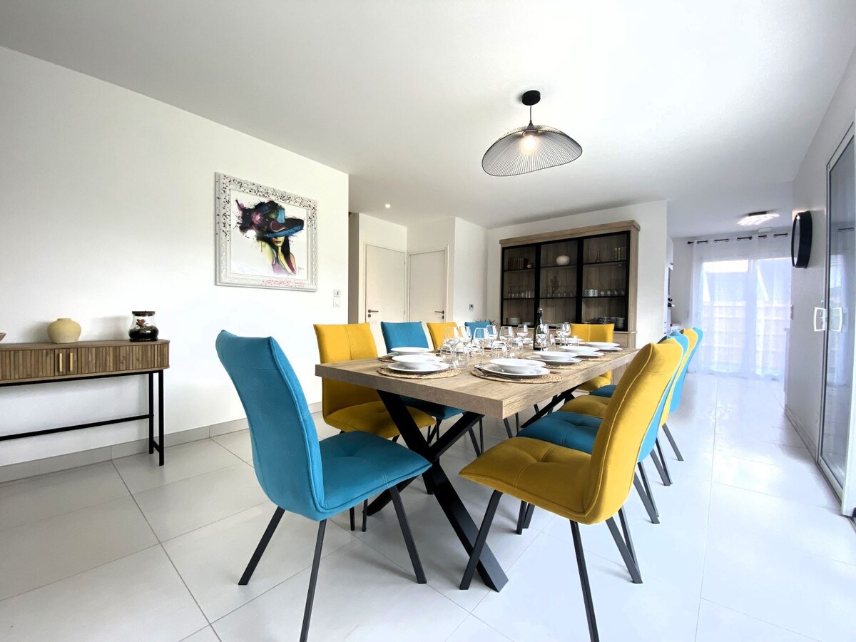 Casa de férias contemporânea, familiar e tranquila, localizada no fundo do seu beco sem saída, entre o porto e a vila de Arzon. 3 quartos, grande sala de estar com lareira e grande terraço exterior de madeira. Casa classificada com 3 estrelas de acordo com os critérios de turismo mobiliado.