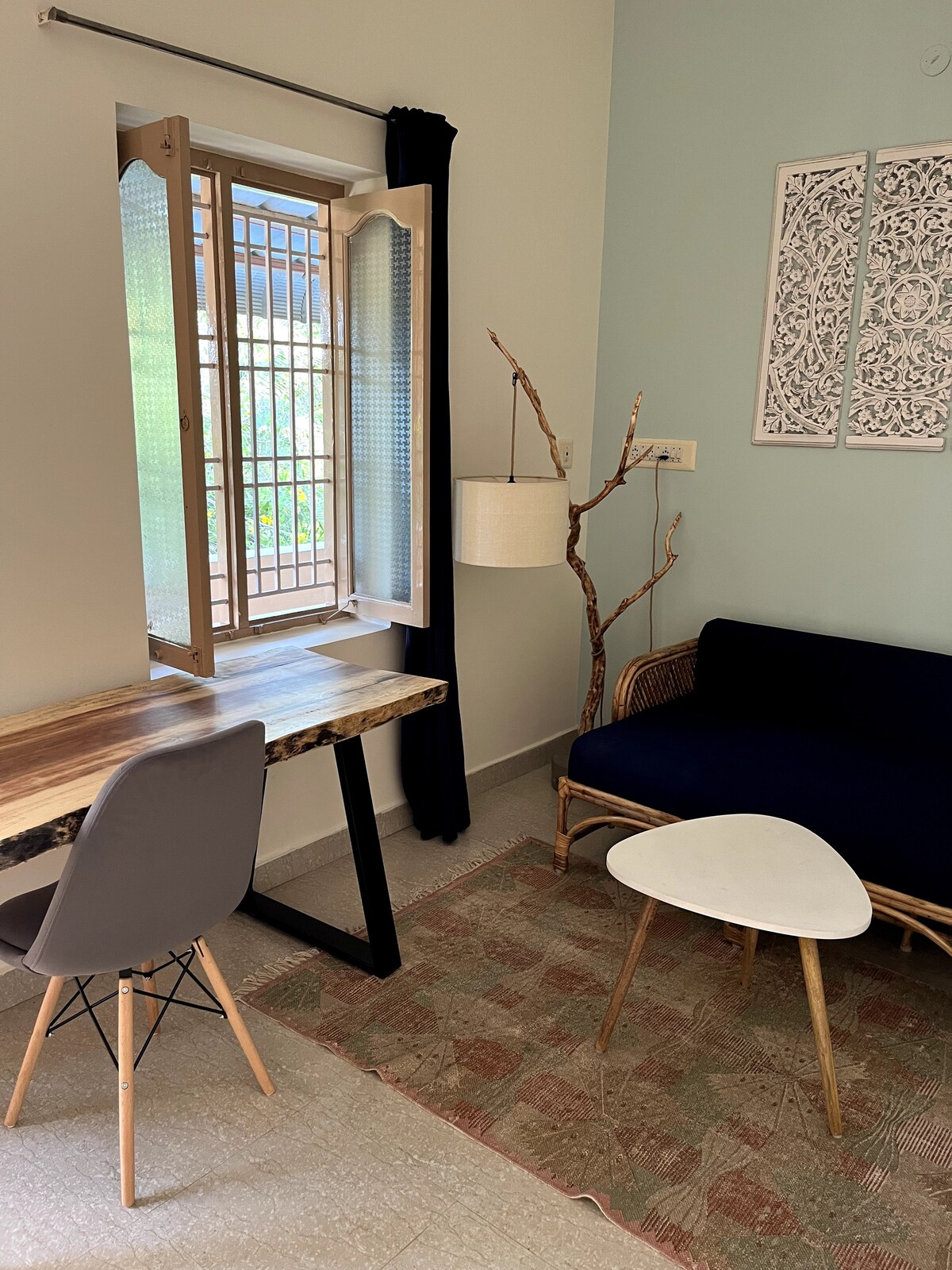 O DL Homestay é um apartamento tranquilo no primeiro andar, localizado no sopé de Arunachala. Oferece uma experiência de vida simples, mas cheia de alma, ideal para viajantes que procuram conforto e tranquilidade. Área de estar: a sala de estar inclui cadeiras e uma mesa baixa para refeições, uma cama de solteiro versátil que funciona como um sofá-cama. Quarto: o quarto acolhedor com ar condicionado tem 2 camas queen com casa de banho anexa e aquecedor de água. Cozinha - comodidades básicas fornecidas. Varanda, terraço e estacionamento disponíveis.