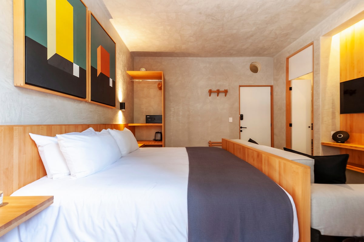 Este espaço é para viajantes que buscam design, beleza, arte, inspiração, conforto e trabalho remoto em uma ótima área. O que mais isso acontece? - WI-FI 100MB - Kitchenette equipada - Cortinas black-out - Camas confortáveis (lençóis de qualidade) - Incrível pressão de água no chuveiro - Local - biodegradável - produtos de higiene pessoal sem crueldade - Água filtrada potável - Elevador - Boas vibrações
