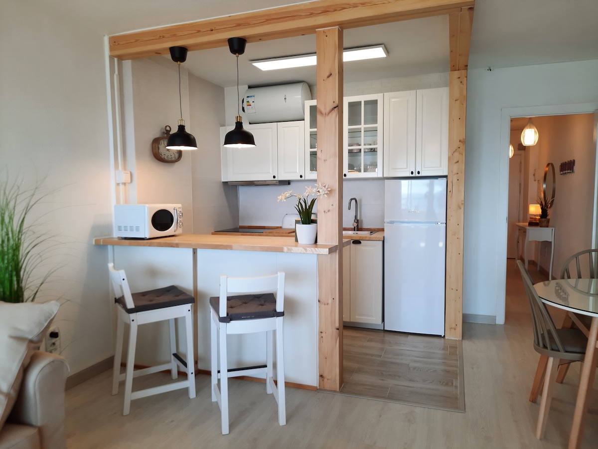Belo apartamento completamente remodelado com material de alta qualidade, situado numa Urbanização Exclusiva. A 1,2 km da praia e do centro da cidade. Inclui casa de banho, cozinha totalmente equipada, sala de estar (ACESSO WI-FI e televisão por cabo), terraço e um jardim privado. Apartamento totalmente remodelado com materiais luxuosos, localizado num empreendimento exclusivo a 1,2 km da praia e do centro. Composto por casa de banho, cozinha equipada, sala de jantar, com ACESSO WI-FI e canais internacionais, bem como terraço e jardim privado.
