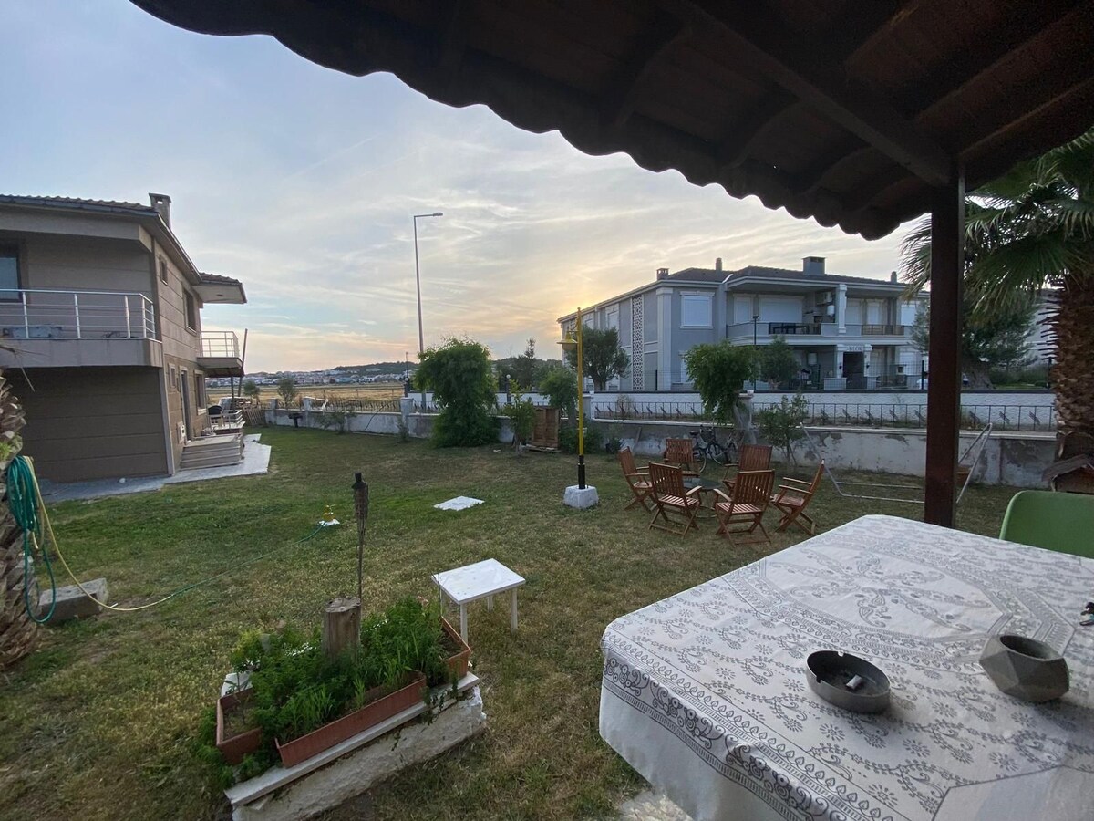 Esta casa privada fica perto de tudo e facilita o planeamento da sua viagem. A nossa casa de um andar, que fica a 100 metros do mar, a 400 metros do mar e do início do centro do bazar, tem 1 quarto duplo onde 2 pessoas podem facilmente ficar, um sofá conversível que pode acomodar 1 adulto ou criança na cozinha, uma casa de banho, o seu próprio jardim, uma lareira na cozinha, ar condicionado, chá, café e torradeira, um mini-frigorífico. Pode fazer churrascos, ler e desfrutar do jardim.