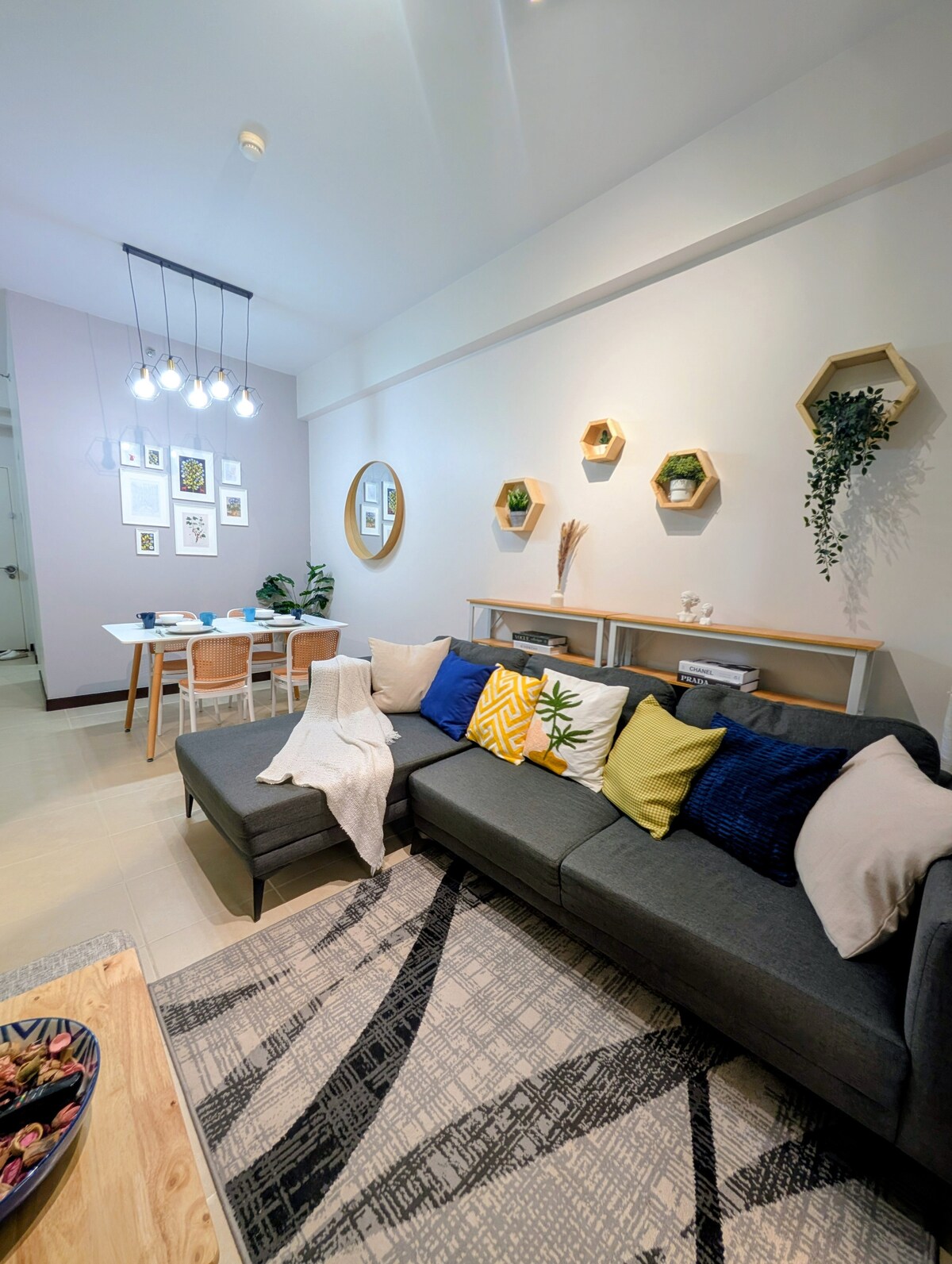 Este espaço é uma fusão de design japonês e escandinavo perfeito para um grupo de 6 pessoas. Tem 2br, 1 cama queen-size, 1 sofá-cama conversível e um deck duplo. A sala de estar tem uma TV de 55 polegadas, jogos de tabuleiro como xadrez e Uno e sungka. A cozinha totalmente equipada oferece uma experiência caseira. Também tem uma mesa de bar e um banco de bar e uma varanda com vista para as luzes da cidade. A unidade do condomínio tem acesso a instalações partilhadas (parque infantil, piscina, área de piquenique, área de corrida pavimentada) e sky lounge.