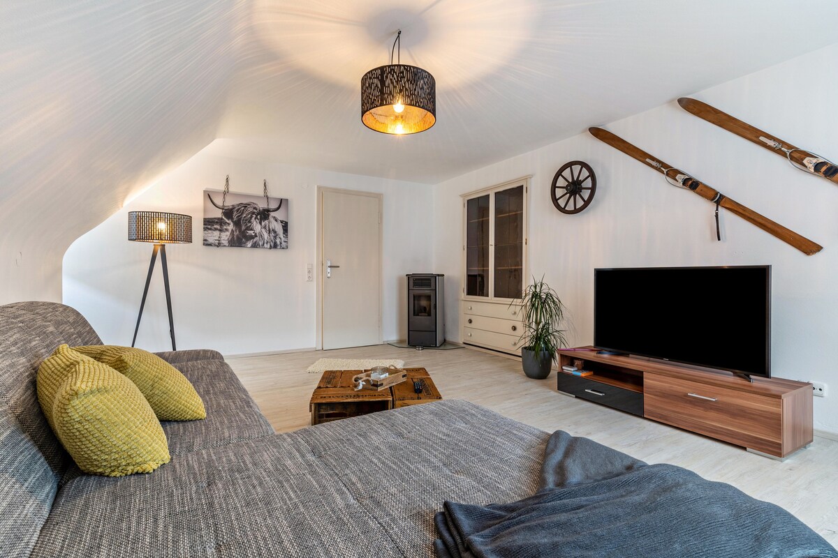 O apartamento central de aprox,90m² com uma espaçosa área de estar/jantar,quarto,cozinha, varanda, casa de banho e sanita separada está localizado na 1ª cave da nossa casa! Com 2 camas individuais e um sofá-cama (sala de estar), haveria espaço para mais 3 pessoas. Uma cama de bebé pode estar disponível mediante pedido Entrega gratuita. Estacionamento disponível diretamente em frente à casa. Lojas, estação ferroviária e parque infantil podem ser alcançados em cerca de 5 minutos a pé. Área de caminhada de água a 200 m de distância. Ponto de partida ideal para caminhadas!