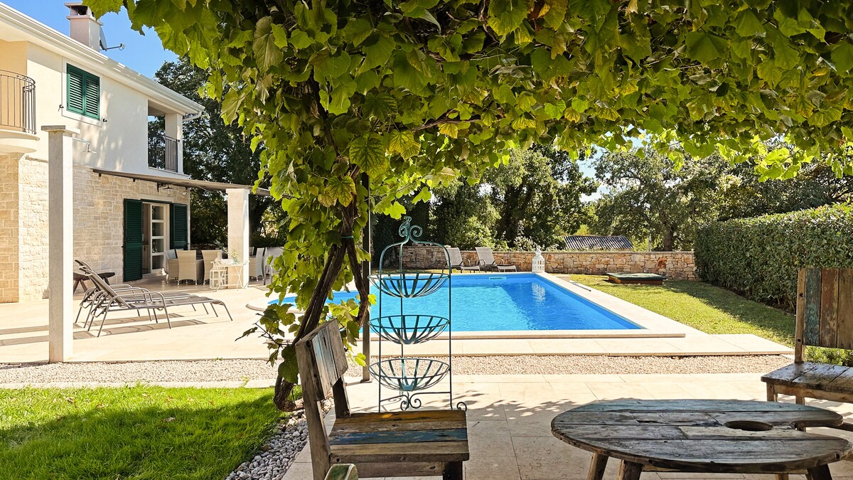 Stylish villa near Rovinj with picture worthy pool, sunk in hot tub, sauna. Wake up to lush, panoramic valley views. Couples and family-friendly, a short drive to adventure park, Brijuni National Park, dinopark, medieval towns & local cuisine. It is a true green escape for anyone looking to get back to nature with all the comfort of modern living. Fully equipped for cooking and entertainment in 2600 m2 of garden (football, speed ball, badminton & pool fun) for your kids and loved ones to enjoy.
