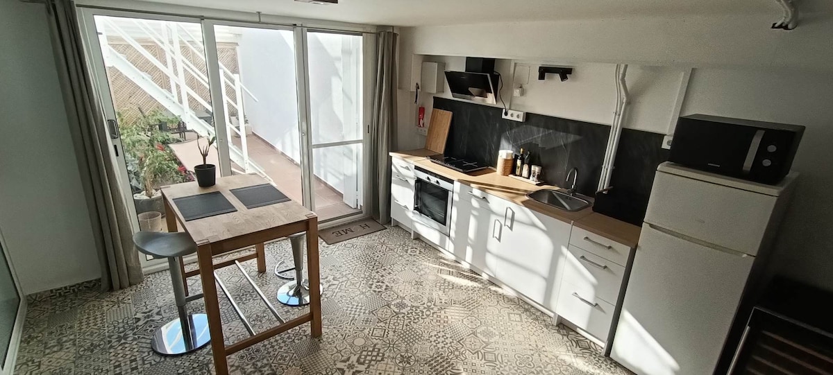 Estúdio privado. Espaço agradável e luminoso com 45 m², pátio privado, cozinha totalmente equipada, lavandaria, casa de banho com chuveiro, quarto, sala de estar, Smart TV e Wi-Fi. Fica a 7 mm de praias, lojas e do centro histórico. O alojamento é acessível por uma escadaria com vista para o pátio. O estúdio foi concebido para acomodar 2 adultos sem filhos.