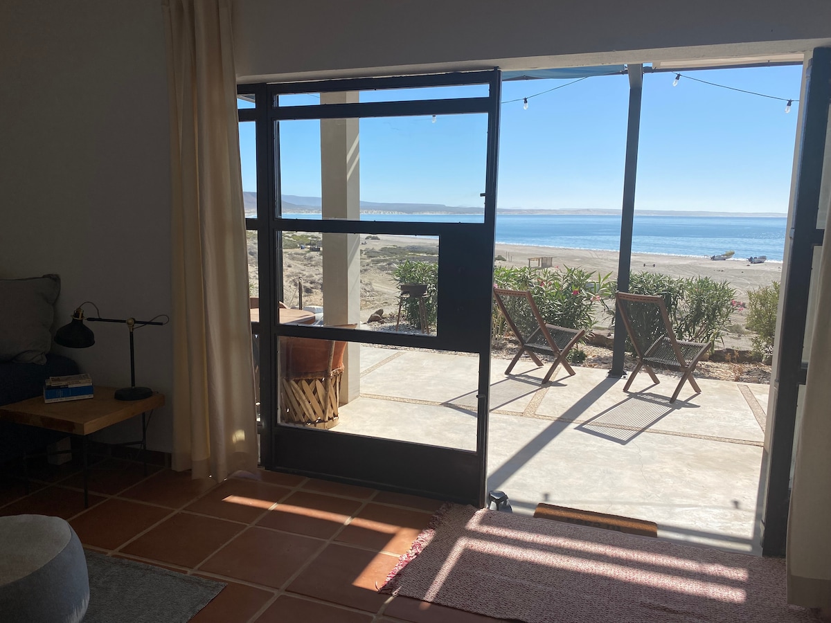 Unbeatable views of mountains AND ocean (no exaggeration) at Casita de Luna, an oasis near the beach. NO smoking/vaping on property. King bed, Starlinklite Wifi, filtered kitchen water, no traffic! Only 3 min walk to beach & 10 min walk to restaurants, market, laundry & sea turtle releases. One neighbor close on north side but open desert & ocean view to south, yet 10 min drive to town with more restaurants & shopping. Surfing a few miles north & whale watching on the big front porch & rooftop!