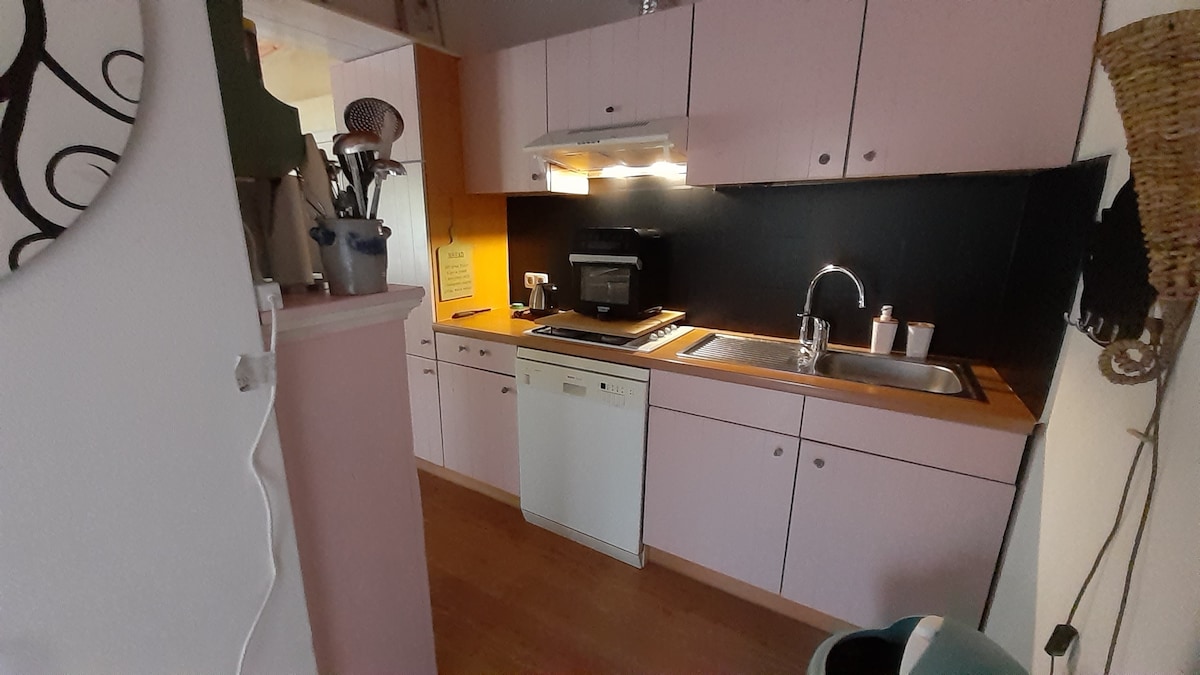 Este apartamento encantador, localizado no primeiro andar, tem uma bela vista sobre o campo, está localizado diretamente na água e oferece muita privacidade. Pela porta da frente, você entra em um corredor espaçoso, onde sobe as escadas e entra no apartamento. Através do corredor, você chega ao quarto com uma confortável cama de casal com box. Em frente ao quarto está o banheiro com o espaçoso banheiro ao lado. No final do corredor, há uma espaçosa e acolhedora sala de estar com cozinha e também dois lugares para dormir.