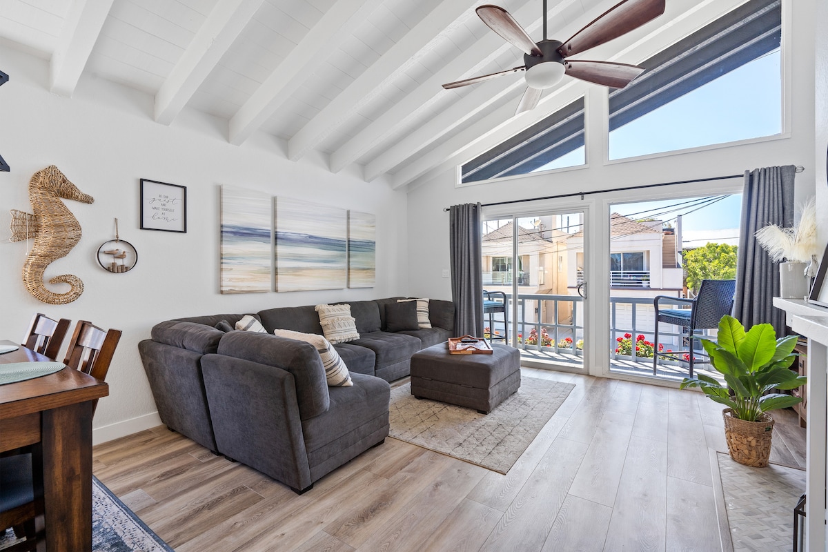 Sip wine by the fire pit at sunset — this coastal retreat is next to the sailing harbor and steps to the sand, Newport Pier, Marina Park, Mom's Beach, waterfront dining and cafes. Designed for laid-back luxury with rare A/C and garage parking. Prime location — no car needed. Why this is a Guest Favorite: ✓ Private patio with fire pit ✓ Central A/C (rare) ✓ Garage + fast EV charger ✓ Beach towels, chairs, boards ✓ Warm outdoor shower ✓ 85" TV + Sonos + fast Wi-Fi Grab your dates — books fast!