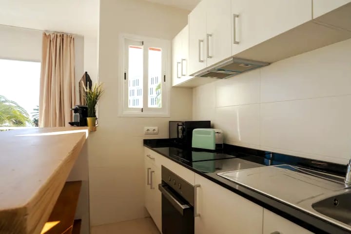 Apartamento com vista para o mar no Aparthotel Voramar com um quarto com duas camas individuais unidas. Dispõe de uma cozinha privada na sala de estar e ar condicionado. Desfrute de entardeceres sobre o mar durante todo o ano e de uma piscina com excelentes vistas. Localização central, a uma curta distância a pé de praias populares e comodidades da cidade. Berço e cadeira de bebé incluídos; conjuntos extra 5 €/noite. Toalhas e roupa de cama incluídas. Artigos básicos de cozinha e casa de banho não fornecidos.