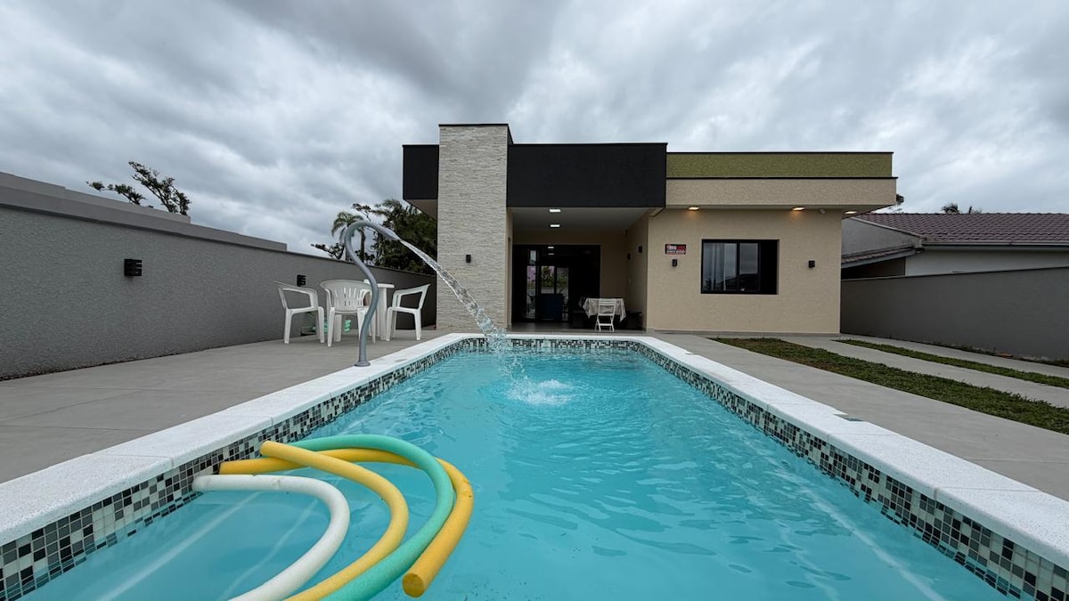 Viva dias incríveis em Guaratuba! Nossa casa moderna oferece total privacidade a apenas 3 min de carro da praia. Perfeita para até 9 pessoas, conta com 2 suítes, ar-condicionado e mezanino para jovens. Destaques: • Piscina privativa com iluminação noturna. • Área Gourmet completa com churrasqueira e cervejeira. • Wi-Fi rápido e 3 vagas de garagem. • Kit bebê: Disponibilizamos berço e cadeirão. Localizada no seguro bairro Cohapar, é o refúgio ideal para famílias que buscam conforto e lazer! 🌊