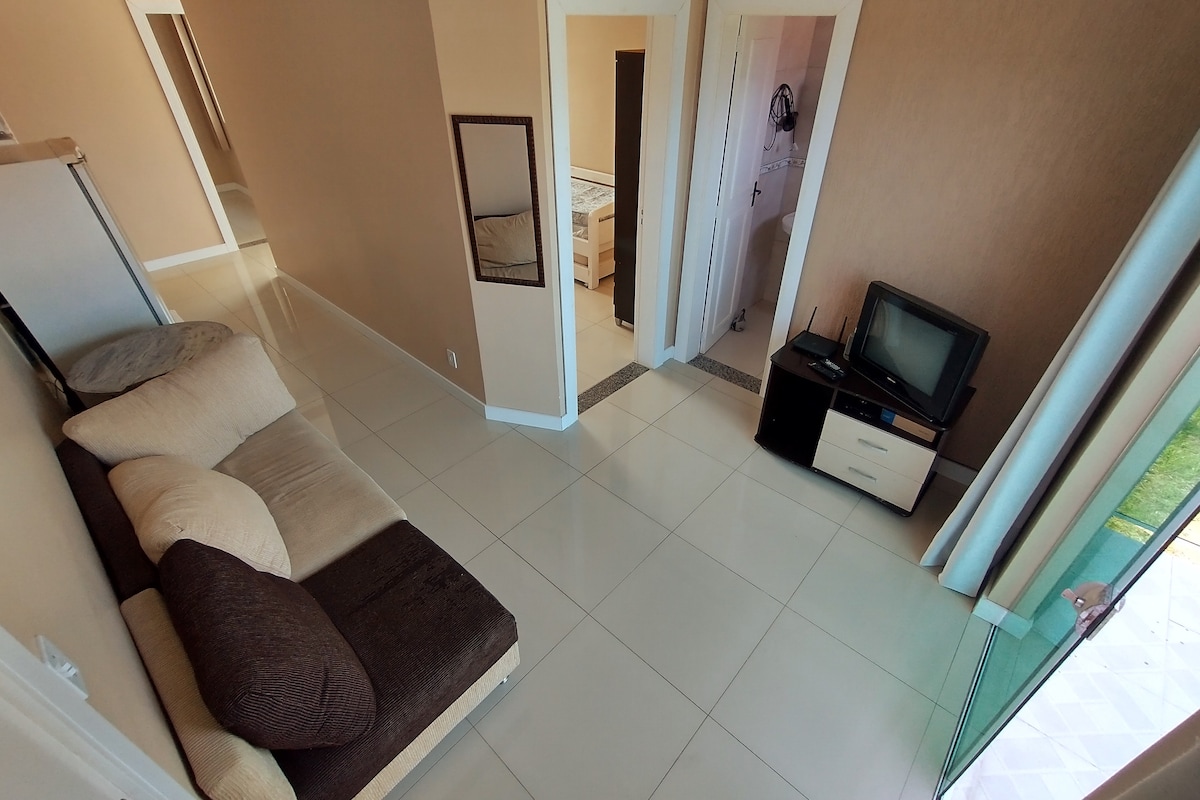 Apartamento novo, simples mas aconchegante possui: -1 quarto com cama de casal e sofá cama na sala, - Cozinha -Sala com TV - 1 banheiro - Churrasqueira - Bem localizado a duas quadras do centro -De frente para o mar - Pátio super espaçoso com vaga para estacionamento. -Local bem arejado
