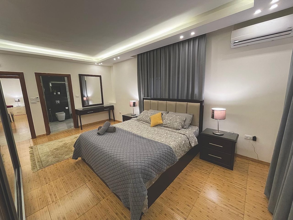 Delicie-se com o luxo e a sofisticação com o nosso novo apto de 3 camas/2 casas de banho em Abdoun, o bairro mais sofisticado de Amã. Mais de 140 m2 de espaço moderno oferecem o máximo conforto, incluindo uma espaçosa área de estar e cozinha totalmente funcional. O apto é adequado para grupos grandes até 7 pessoas. Comodidades incríveis: Smart TV de 65" com Netflix, Youtube e Mirroring Internet de Fibra Rápida O apartamento fica a 2 minutos da Embaixada dos EUA, do Taj Mall e de outros locais animados, como Sweifieh e Abdoun.