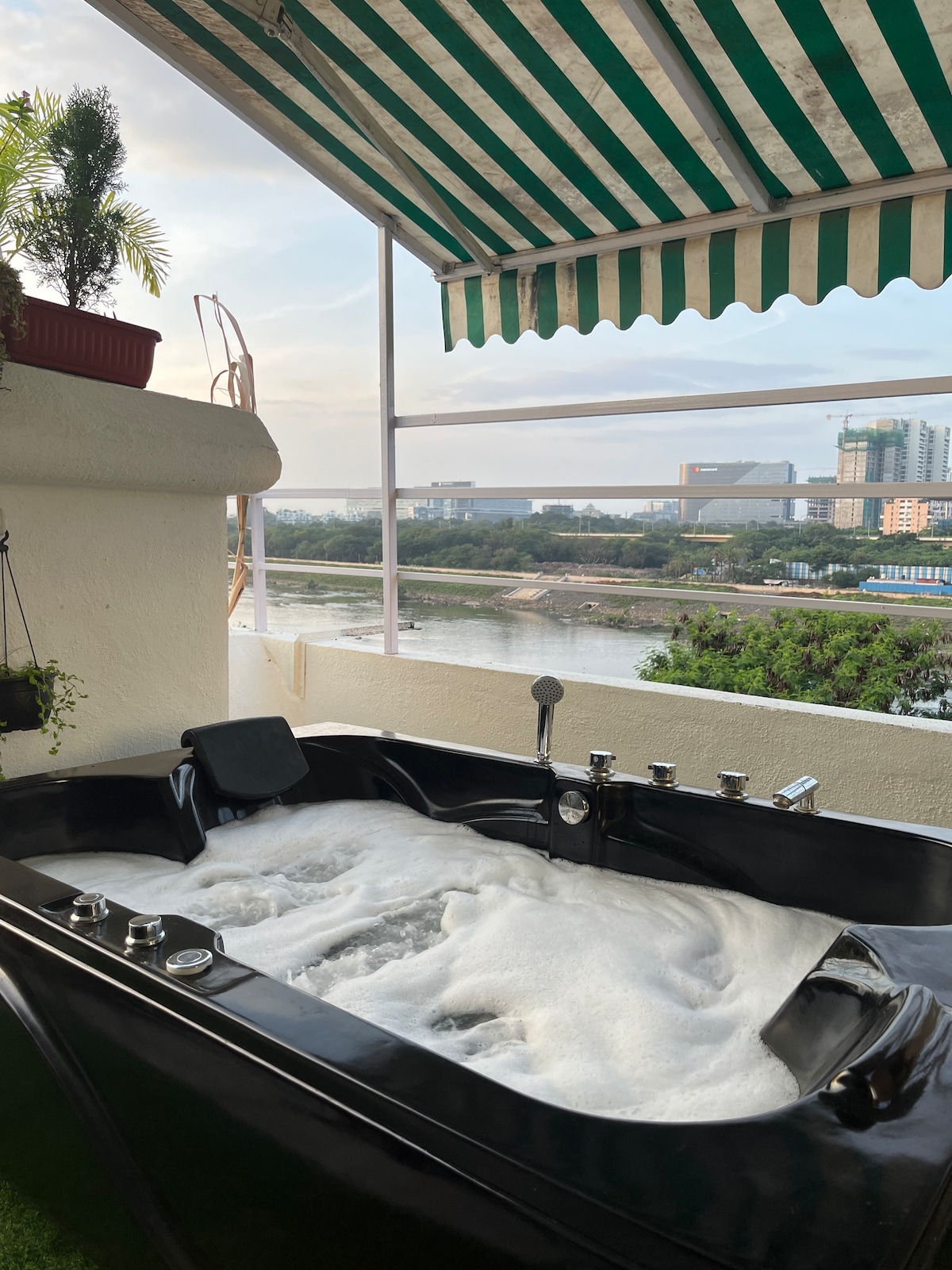 Luxurious Riverside Golf Resort Lifestyle at our home on the HIGHEST FLOOR with a BREATHTAKING view, located opp MCA Stadium, Pune. Wifi enabled fully Air Conditioned 1BHK Apartment, in a very secure gated complex, with luxurious amenities like Cricket Ground, 45 acre Golf Course, 1 km long Riverside promenade with boating facilities, 25 m swimming pool with a separate baby pool, Library Lounge, Party Hall, Gymnasium with Yoga and Meditation facilities, A 30 seater private theater.