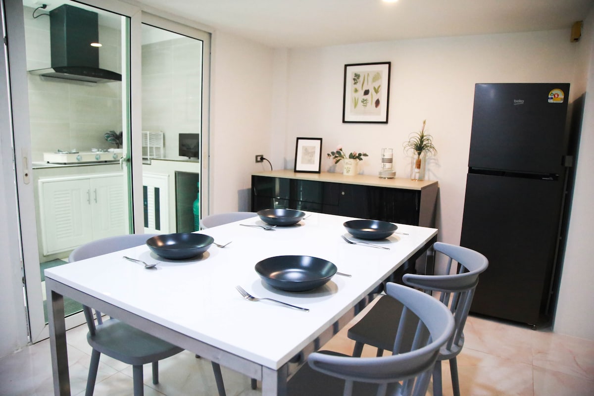 Casa de estilo de vida confortável, Townhome 3,5 andares, com 4 quartos, 3 banheiros, 1 sala de estar e sala de jantar Cozinha totalmente equipada (fogão a gás, micro-ondas, chaleira, geladeira, utensílios de cozinha). Máquina de lavar roupa e área de secagem de roupas. Onde você pode ficar em espaços e pacificamente, mas também localização conveniente para acessar qualquer lugar em Bangkok pela linha de trem BTS Sky conexão perfeita com a maioria das atrações populares de BKK. Apenas 900M por 12 minutos a pé até BTS Bearing!!!