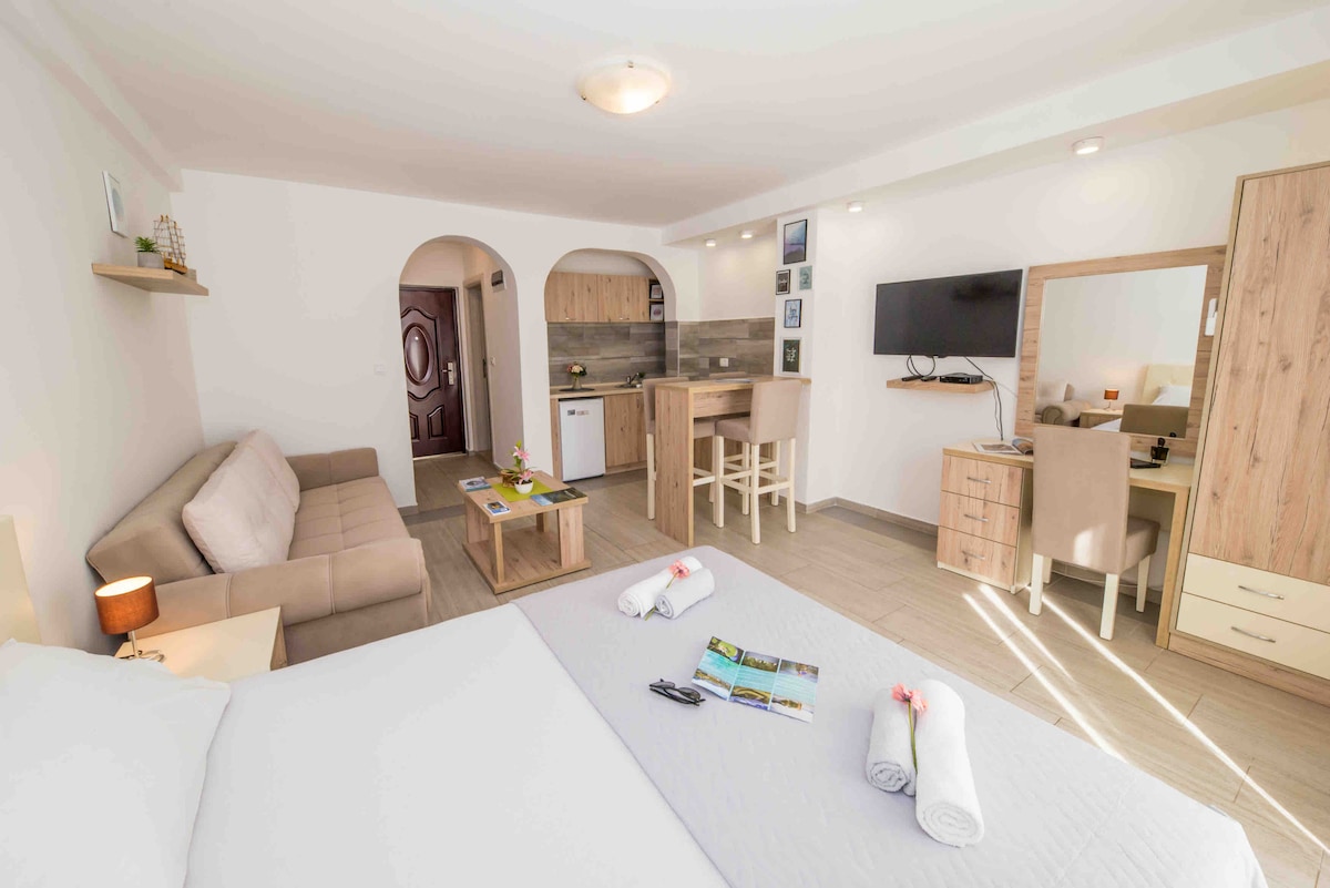 Procura natureza, ambiente tranquilo, belas vistas, belas praias, água limpa e cristalina? Procura um apartamento confortável e moderno com uma varanda e vista para o mar perto da praia? Procura um anúncio de comida para que possa desfrutar plenamente de cada momento do seu sonho e férias há muito aguardadas? Procura um hotel com piscina e espreguiçadeiras junto a uma praia intimista? Quer estacionar o seu carro numa garagem à sombra? Arabela 2 Apartments é perfeito para si.