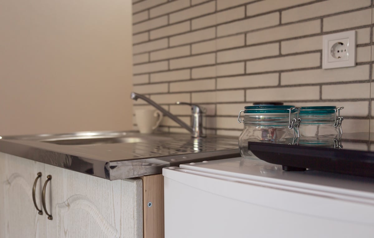 O apartamento tem uma cama de casal confortável e um sofá com roupa de cama, mobiliário necessário, ar condicionado. O canto da cozinha está equipado com uma máquina de café elétrica, um mini frigorífico e utensílios de cozinha. Uma casa de banho com toalhas