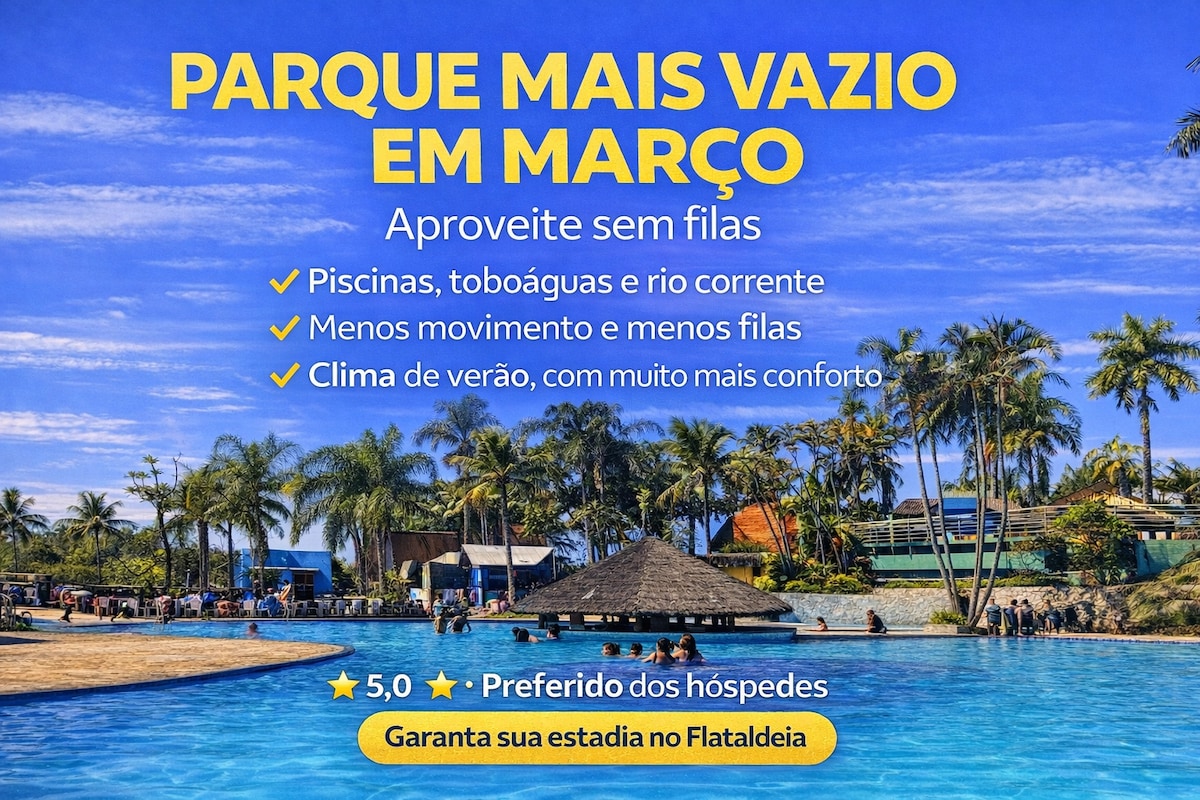 Andar térreo, próximo a todas as atrações do condomínio. Flat com micro-ondas, air fryer, panela de arroz, geladeira, filtro, sanduicheira e cafeteira. Comodidades para estadia mais confortável. Ar condicionado no quarto e sala. Acomodações para 5 pessoas. Queremos transformar seus momentos inesquecíveis com conforto e simplicidade. Desfrute das piscinas. Visite o Aldeia das Águas e todas as suas atrações (ingressos vendidos a parte). Serviço de TV com mais canais e qualidade de imagem.