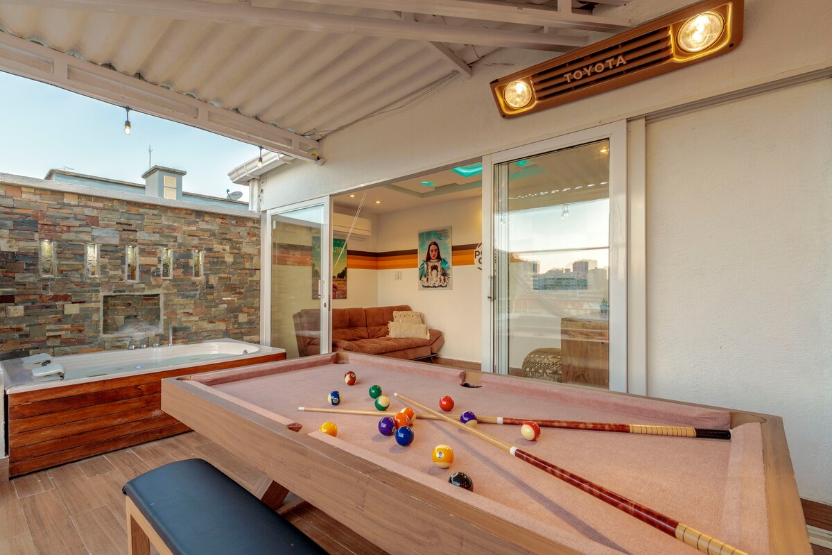 Penthouse com terraço, jacuzzi, mesa de bilhar e 4