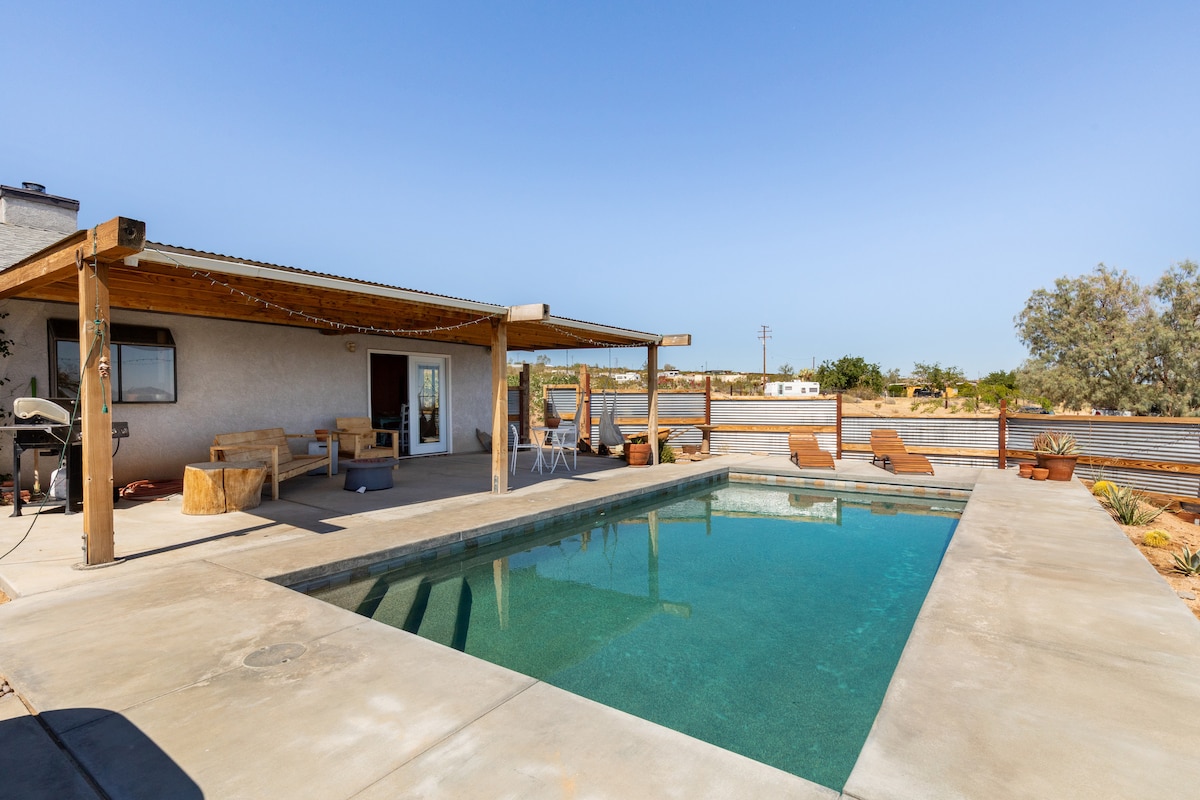 ✅ 5 Acres of Joshua Trees and epic views ✅ Knowledgable Superhost! 24+ years in the area - we help you make the most of your stay! ✅ Unique art and custom finishes by the owners ✅ Hot Tub ✅ Cowboy Pool ✅ Firepit ✅ Deck ✅ Pet friendly ✅ Hammocks ✅ 5 Zone Heating/AC ✅ Spacious open concept living ✅ Fully furnished kitchen ✅ Private Office ✅ Meditation room ✅ Premium mattresses and sheets ✅ Fast Starlink Wifi ✅ Sonos Speaker ✅ Giant Foosball Table and games ✅ 65" LG 4K Smart TV w/ Airplay, Max, etc