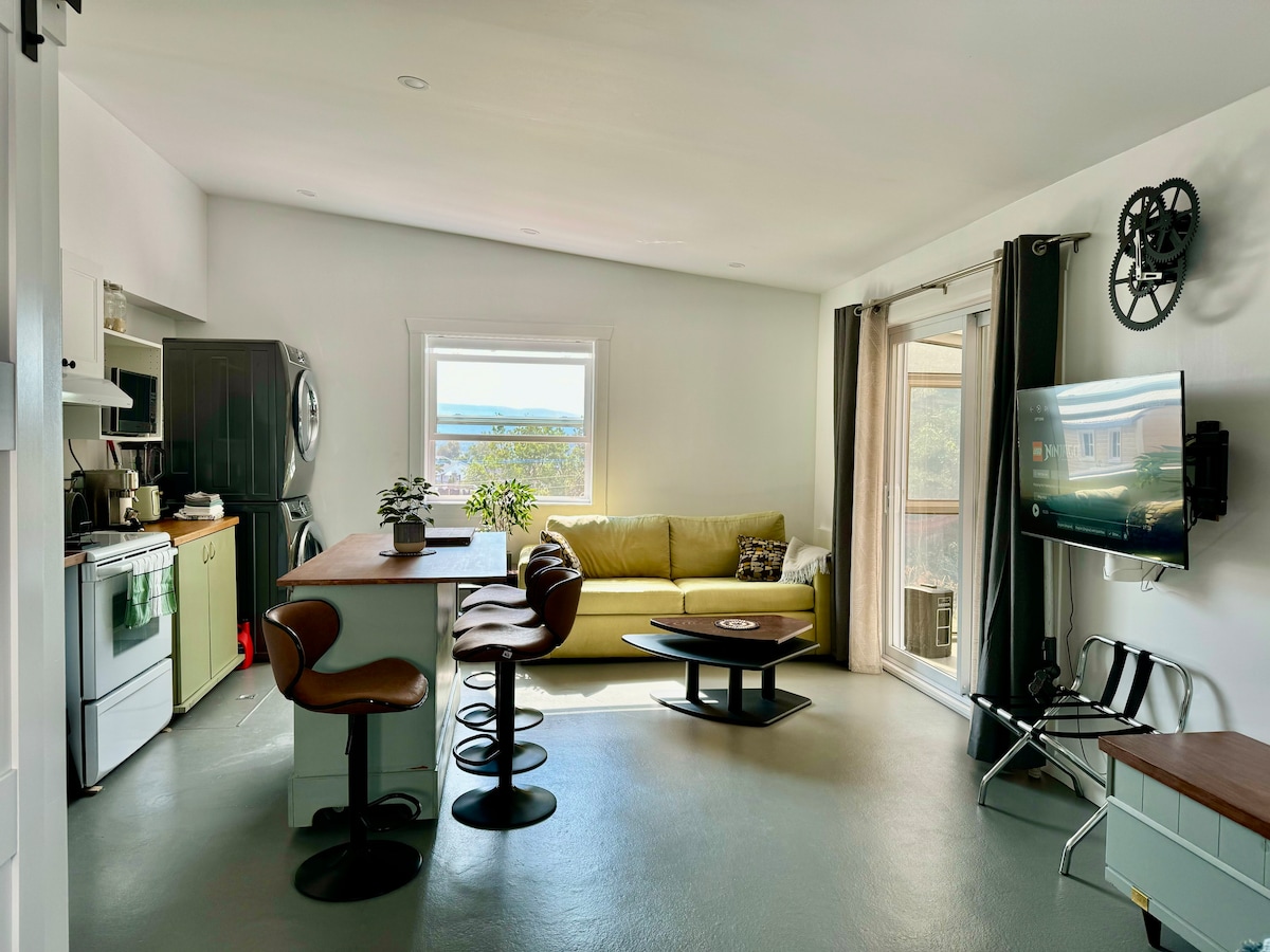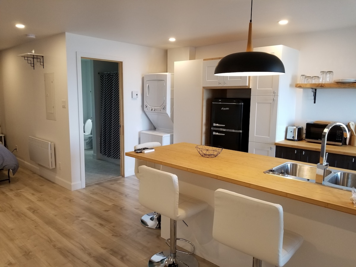 Seu espaço em Matane está localizado no centro da cidade, perto do rio e do mar. É um estúdio novo e bem iluminado, com tudo o que você precisa para cozinhar: geladeira, placa de indução com 2 bocas, forno de convecção portátil de grande capacidade e todas as comodidades. Uma cama queen size, espaço de trabalho com Wi-Fi de alta velocidade e uma smart TV. Na temporada, você tem acesso à churrasqueira, ao pátio traseiro e à lareira externa.