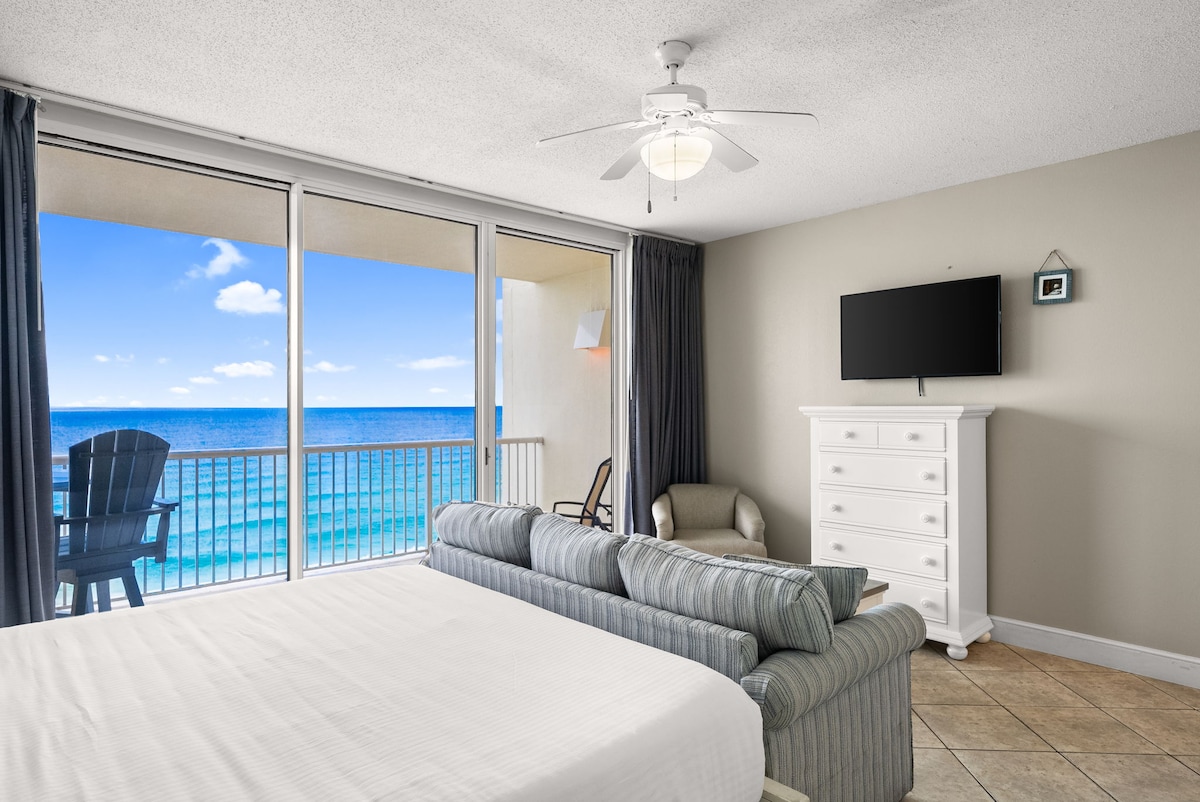 Wake up to the golden morning light and soothing sound of the Gulf in this newly decorated studio at Majestic Beach Resort. This relaxing 14th floor unit sleeps 3 with a king and twin bed, has a well-equipped kitchen and one bathroom with a walk-in shower. Log in to your favorite streaming accounts with the 55" 4K Roku TV. Enjoy amenities like 3 outdoor pools, 2 indoor pools, movie theater, bar & grill, market, and more. This unit includes 2 reserved beach chairs and an umbrella from 3/1 - 10/31