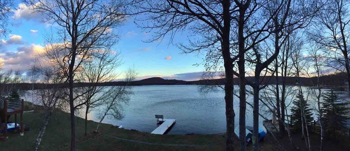 Bela vista do Lago Wallenpaupack. Ideal para famílias. Há um quarto principal com uma cama king e uma casa de banho privativa. Dois quartos com cama queen adicionais com uma casa de banho partilhada. O piso principal tem uma cozinha totalmente equipada com uma área de refeições com 8 lugares, sala de estar com lareira a gás e sala de estar e casa de banho completa. O piso inferior tem uma sala familiar com televisão e um sofá-cama e um pátio. Há um deck no piso principal, à beira do lago da casa.