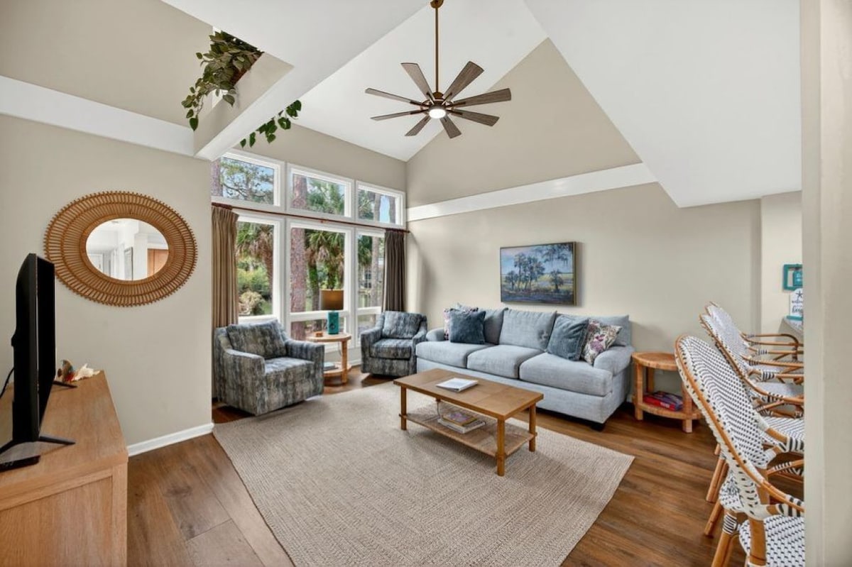 Gated Beach & Golf Resort! ✨Top 5% Airbnb Guest Favorite✨ Beach, Golf, Pool, Spa, Restaurants & Bars FREE Pickleball & Tennis – across the street HGTV Decorator designed Panoramic Golf & Lagoon Views! Big Porch Lush Landscape Tons of Wildlife Coastal Décor Sunny 1st Floor End Unit KING BED + 2 QUEENS 3 XL SmartTVs FAST WIFI & CABLE Chef's Kitchen Washer/Dryer BBQ Beach Cart, Chairs, Boogie Boards, Ice Chest Walk/Bike/Drive to Beach Walk to Golf Club & Pub Close to Coligny Summer Beach Shuttle