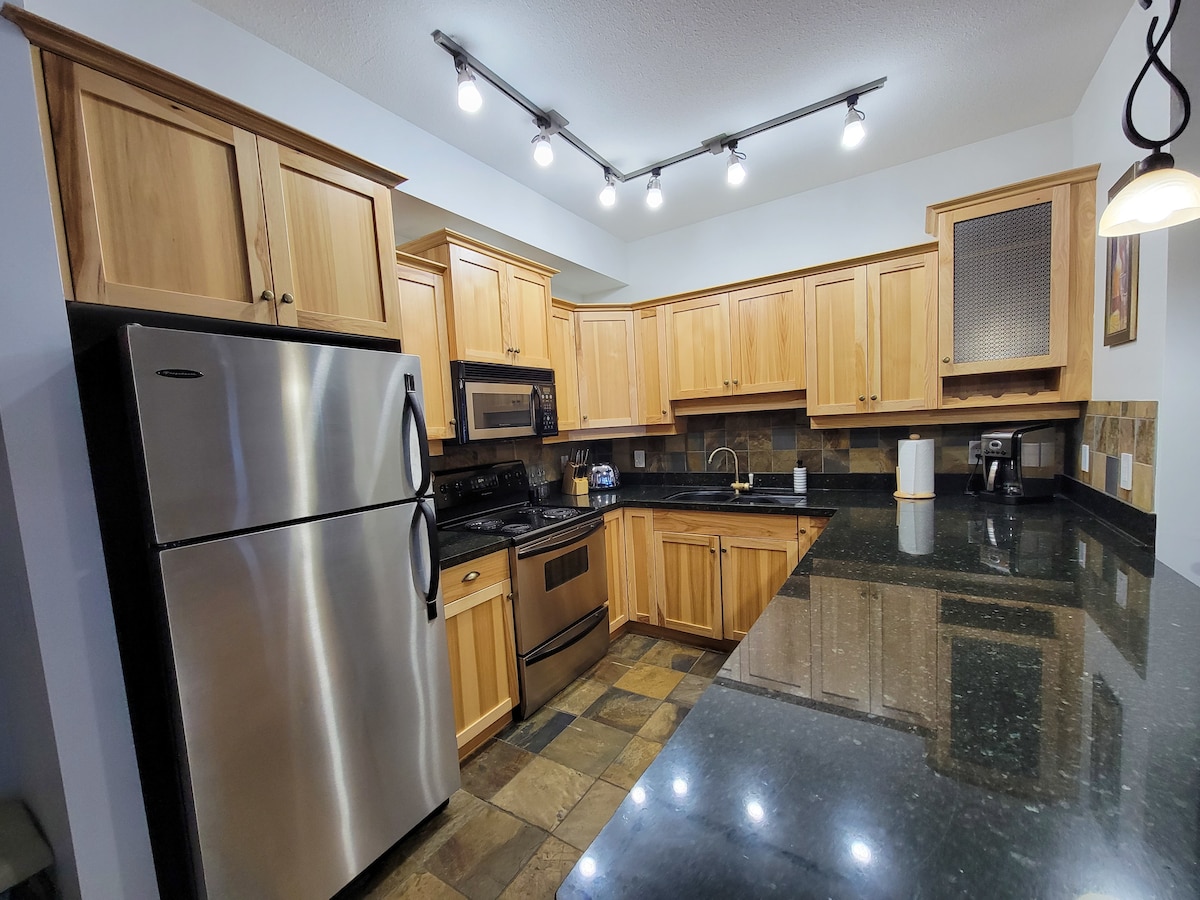 Spacious two bedroom condo at Glacier Lodge. True ski in ski out location and only a 5 minute walk to the village. Don't get stuck with a long walk or drive or a not truly ski out experience. Stay warm this winter with a private hot tub, gas fireplace, heated floors, and steam shower. The oversized balcony provides privacy for a soak or for simply enjoying the fresh air. Enjoy underground parking, a fully equipped kitchen, and in suite laundry