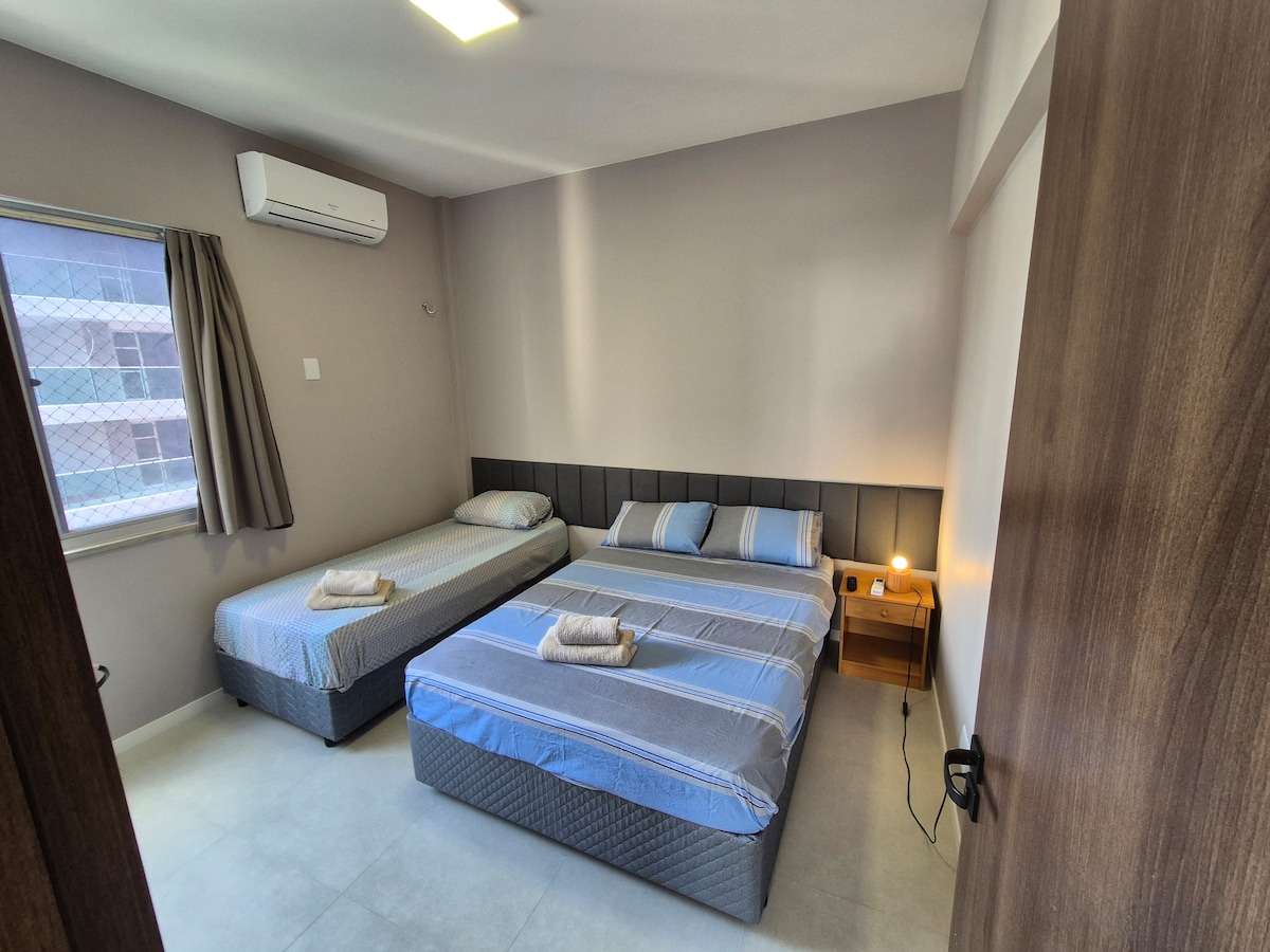 Apartamento excelente para casal com cama queen size e possibilidade de ate 4 pessoas com o sofá cama localizado na sala. Dois banheiros completos com chuveiro elétrico e ar condicionado em todos os ambientes. Garagem para um veículo. Cozinha com geladeira duplex, fogão a gás com forno e filtro duplo de água. Smart Tv de última geração 4K na sala e quarto.Internet de fibra ótica de alta velocidade, espaço para home office no andar superior(para maior conforto e produtividade). Lava e seca roupas