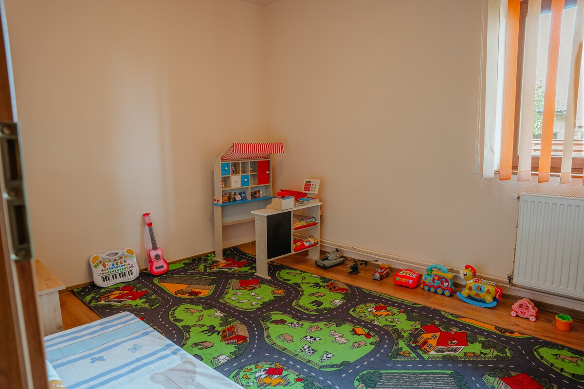 Familia ta va fi aproape de tot, stând în această locuință situată central 🏡 8-10 locuri de cazare 🛏️ 3 dormitoare cu băi proprii 👫 Perfectă pentru familii și prieteni apropiați 🔥 Living open-space cu bucătărie utilată, 1 baie 📺 Smart TV, internet, mașină de spălat rufe și vase 🛝 Loc de joaca exterior pentru copii 🍽️ Foișor cu grătar și ceaun - serile capătă gust de poveste