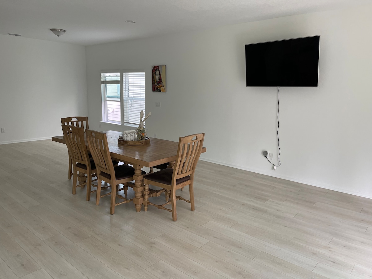 A moradia tem um piso térreo que é muito adequado para idosos e pessoas com necessidades especiais, porque tem um quarto com duas camas queen, casa de banho completa, cozinha, sala de estar, área de jantar, uma saída para uma sala de jogos, um pequeno quintal e uma lavandaria. O segundo andar tem 2 quartos + casa de banho completa + berço + TV. Um deles é um quarto de passagem e não tem janela. Estacionamento amplo (4 carros). Boa localização em Orange Park. Área tranquila.