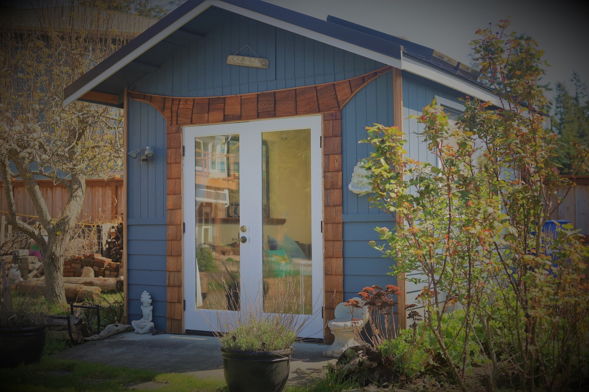 Bem-vindo ao Cedar Cottage, aninhado na floresta da Ilha Whidbey. O quarto cheio de arte oferece uma cama king size, banheira com chuveiro e penteadeira separada. As comodidades incluem um frigobar, cafeteira Keurig, chaleira elétrica, micro-ondas, forno elétrico, TV grande e Wi-Fi com acesso à Internet de alta velocidade. Desfrute de café da manhã na varanda coberta, jantar sentado ao redor da fogueira Solo Stove. Situado em cinco acres de floresta a sete minutos da pitoresca Langley, o chalé é um paraíso recém-construído pronto para você!