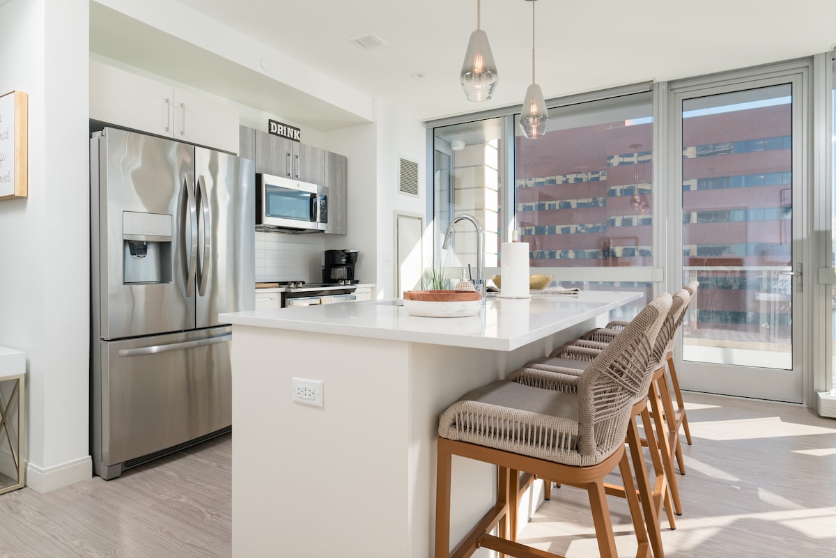 Experimente o seu próximo retiro de apartamentos altos na Praça Kendall, onde interiores elegantes se harmonizam com vistas panorâmicas do horizonte da cidade através de grandes janelas. Mergulhe numa cozinha totalmente equipada e em quartos queen size. Explore o ginásio partilhado, o jardim exterior e o centro de negócios do edifício. Desfrute da proximidade de centros de inovação, como Harvard Square e Cambridge Innovation Center, criando um retiro vibrante/confortável. Ginásio ✔ partilhado no horizonte✔ da cidade Estação ✔ de Trabalho ✔ Design elegante e elegante