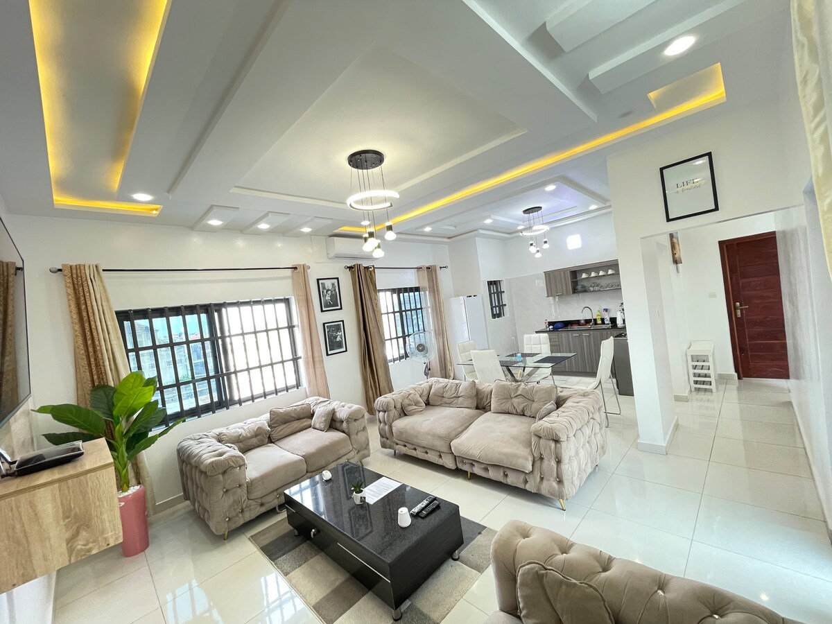 Enjoy this elegant, comfortable and luxurious 2-story-duplex with new kitchen cabinets as well as Cooling Gel Infused Mattresses for Pressure Relief. You have the entire second and third floor and the rooftop to enjoy The entire second floor has a full size kitchen with all imported new appliances, oven, gas cooker, a large island and crafted couches for your relaxation. The 3rd floor has all the 3 bedrooms. The rooftop offers an amazing view (like none other) of the entire city of Cotonou.