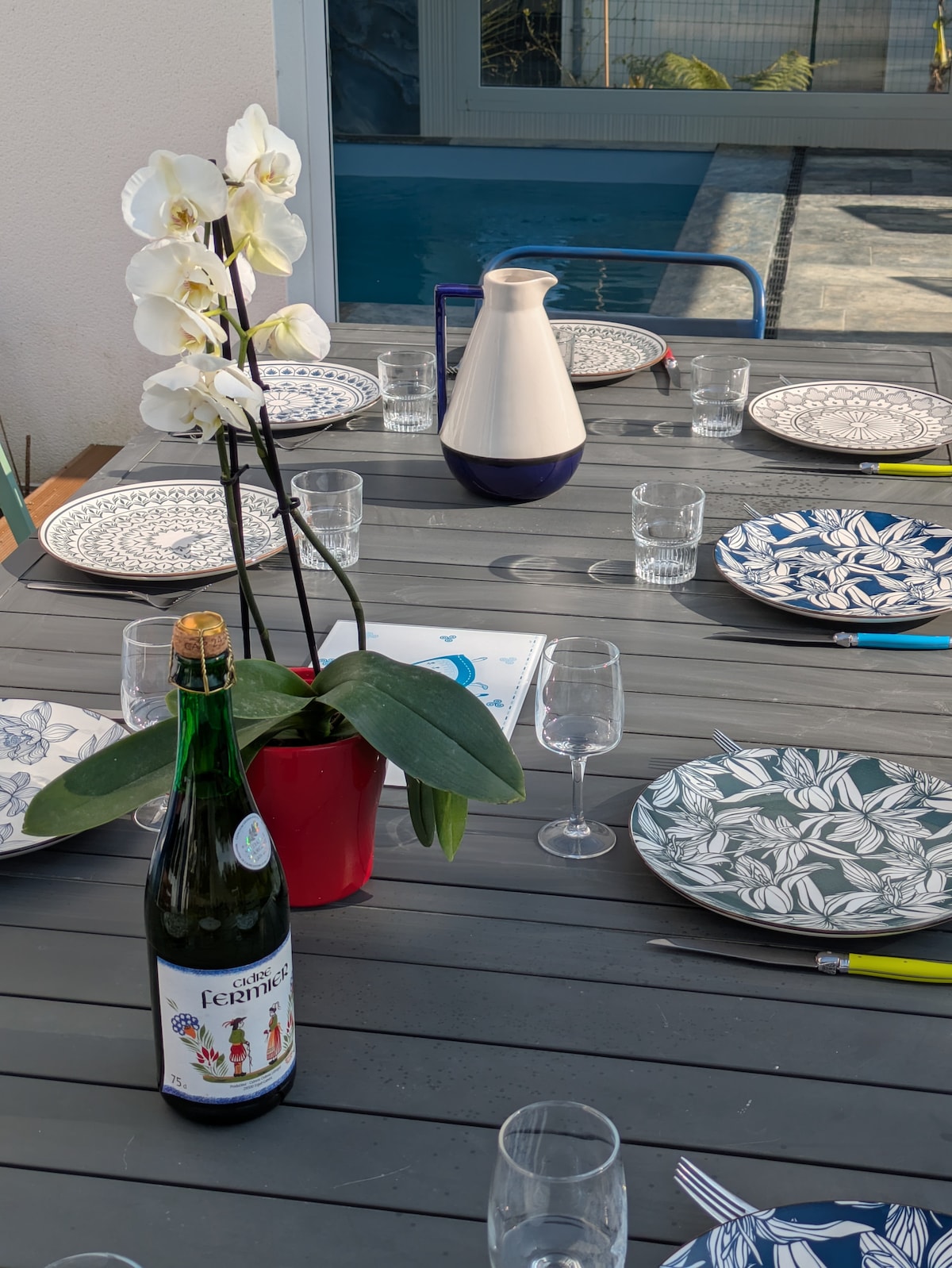 Casa nova e espaçosa com uma piscina interior segura de 3x7 m. Acesso por um pequeno caminho (300 m) à praia da Letty Lagoon. Pessoas 10: 3 quartos com cama queen e casa de banho 2 Quartos cada com 2 camas individuais casa de banho. 3 sanitas A cozinha, a área de jantar e o lounge têm vista para a piscina e dois grandes terraços com um jardim vedado. Pás disponíveis. Bénodet é fácil de andar, bem como excelentes baladas. Lençóis, toalhas e limpeza incluídos