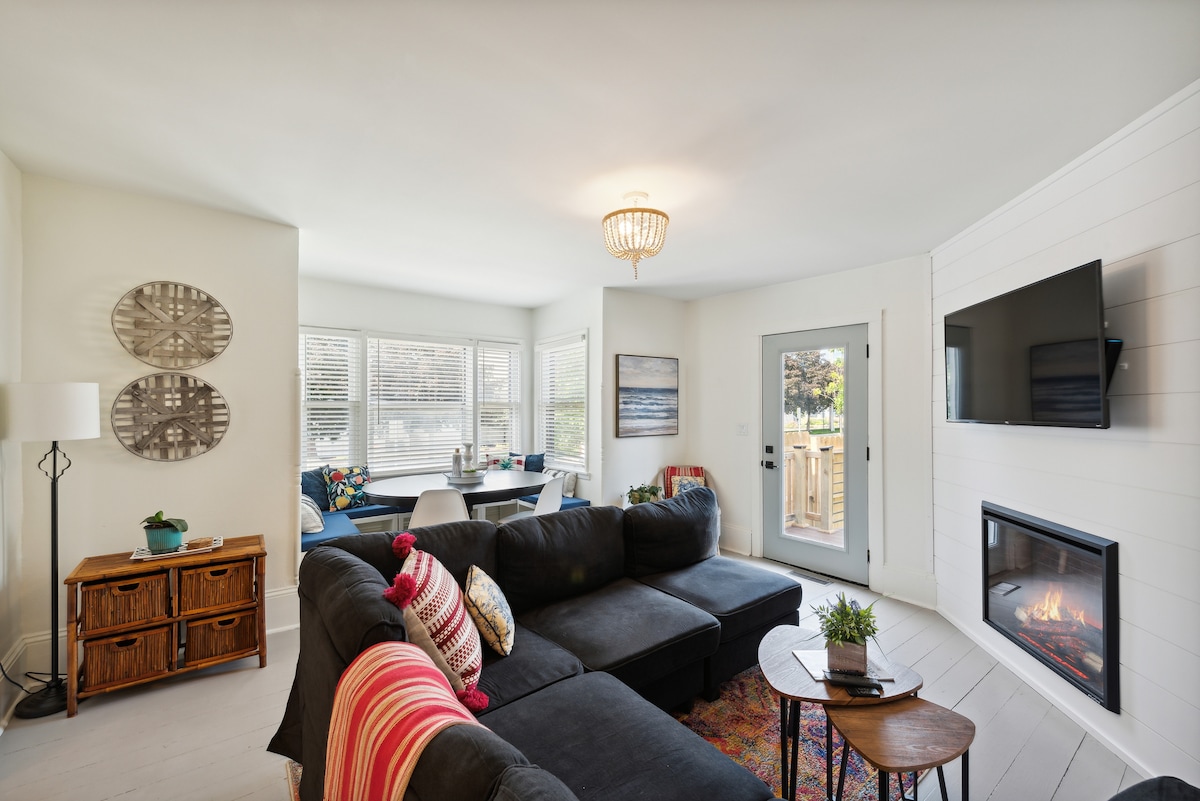 Sumptuous 4 BR/2.5 BA vacation home, just 1 block from Lake Michigan. Fully refurbished with reclaimed flooring, antique beams, custom doors, and fixtures. High-end kitchen, dining, and living areas with French windows. Living room features a stone fireplace, stylish couches, and a wide-screen TV. Three ground-floor bedrooms and baths with a second-floor bunk bed loft. Detached garage is a posh game room with high-end tables and a big TV. Covered patio, 4-seat dining, and bluestone courtyard. This property has been selected for inclusion in The 100 Collection, a global designation awarded to only the top professionally managed vacation rentals based on consistent quality and service. Classy, awe-inspiring, and sumptuous, this 1928 4 BR/2.5 BA vacation home, located just a block from Lake Michigan in “Harbor Country,” was once a local retail gathering place. Recently refurbished into a stunning residential home, it includes gorgeous reclaimed flooring from antique beams, custom doors, light fixtures, and hardware, as well as top-of-the-line plumbing fixtures. The kitchen-dining room-living room area—a massive, superbly well-lit space—features entire walls of French windows, original glass-block, and a wide array of seating options for meals: 4 chic stools at the white marble island, 4 leather seats around a circular marble coffee table, and a 10-seat reclaimed wood dining table. The beautifully lit living room has a classic stone fireplace at its center, stylish (yet ultra-comfortable) couches and chairs, and a wide-screen TV. In addition to the three bedrooms and bathrooms on the ground floor, there’s a second-floor sleeping loft, perfect for kids with cute bunk beds and a real (mini) teepee. All bedrooms feature top-quality bedding and linens, ensuring a sound sleep and sweet dreams for you and your guests. Black Door Bungalow can sleep up to 10. MAIN FLOOR Primary Bedroom: 1 King bed Bedroom 2: 1 Queen bed Bedroom 3: 1 Queen bed UPSTAIRS FLOOR Bedroom 4: Full-over-full bunk bed that sleeps 4 Another “extra” is the detached garage, which has been turned into a posh game room, with high-end shuffleboard and foosball tables, a big-screen TV, and a sound system. The exterior—featuring a spacious covered patio with cozy rattan couch, chairs, and a 4-seat dining table, leading to a bluestone courtyard—has been extensively landscaped with lush plantings, trees, and professional lighting. The home also includes a high-end kitchen, EV charger, and laundry appliances. In addition to being an easy walk from a majestic, crystal-sand Lake Michigan beach—and a super-short drive to popular beaches like Pier Street Beach and Cherry Beach—you and your guests can also enjoy the many activities afforded by being near Warren Woods State Park, which offers all sorts of woodland hiking and biking trails. The region’s largest recreational harbor provides countless water-related excursions and rentals, from fishing trips to boat, kayak, jet-ski, and paddleboard rentals, as well as day and evening cruises. There’s also the Acorn Theater, a local treasure for live performances by nationally recognized music artists, and a number of nearby breweries, wineries, brew pubs, and even an award-winning distillery for you to check out. Of course, you and your guests can also enjoy sampling to your heart's content the many popular restaurants, cafes, art galleries, boutiques, and antique shops just a hop, skip, and a jump away in Union Pier and downtown New Buffalo.