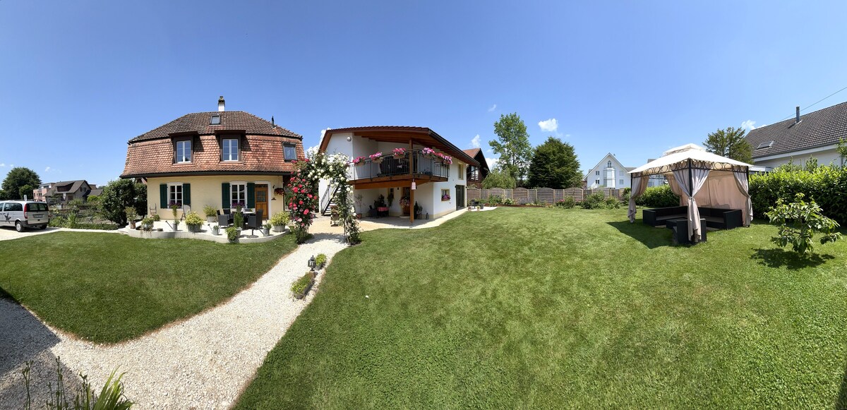 Rural e ainda não muito longe de qualquer civilização encontra-se o nosso pequeno sonho de vida e jardim. A antiga casa de pedra está localizada em Ersigen, perto de Burgdorf BE, a vinte minutos de carro de Berna. Na aldeia há um café, três restaurantes e uma loja de fazenda. O ônibus para o principal shopping mais próximo sai a cada 30 minutos durante o dia. Ocupamos o segundo andar da casa e alugamos dois quartos com cozinha e banheiro no primeiro andar. Ficaremos felizes em responder a qualquer dúvida que você tiver!