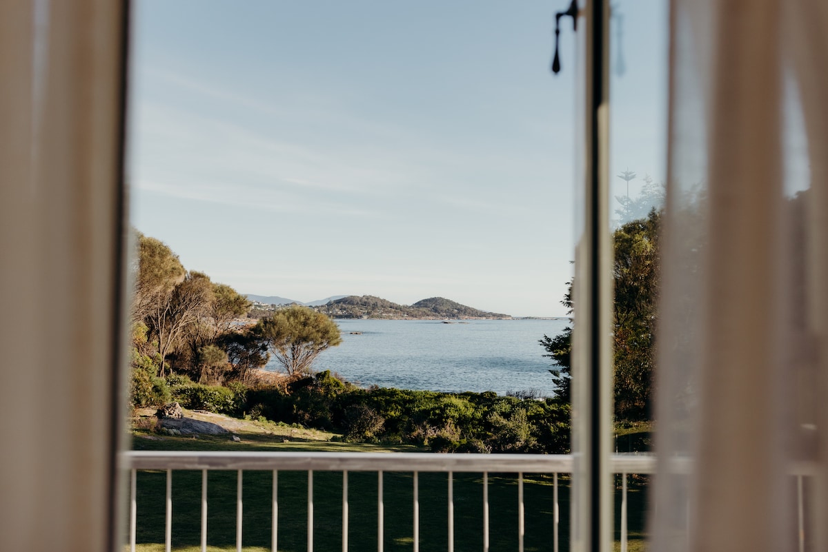 Bem-vindo a The Burrows, uma casa de pedra de 1860 que reinventámos e restaurámos com sensibilidade, abrindo-a para apreciar a vista em constante mudança sobre a península de Freycinet. Um grande espaço de estar é o coração da casa com uma lareira de madeira numa extremidade, sofá de penas, poltronas e um assento de janela personalizado com vista para a Great Oyster Bay. Ambos os quartos têm vistas incríveis sobre a água e a nossa casa de banho íntima com banheira de pés de garra e portas francesas é o lugar perfeito para ver o pôr do sol refletido sobre os Hazards.