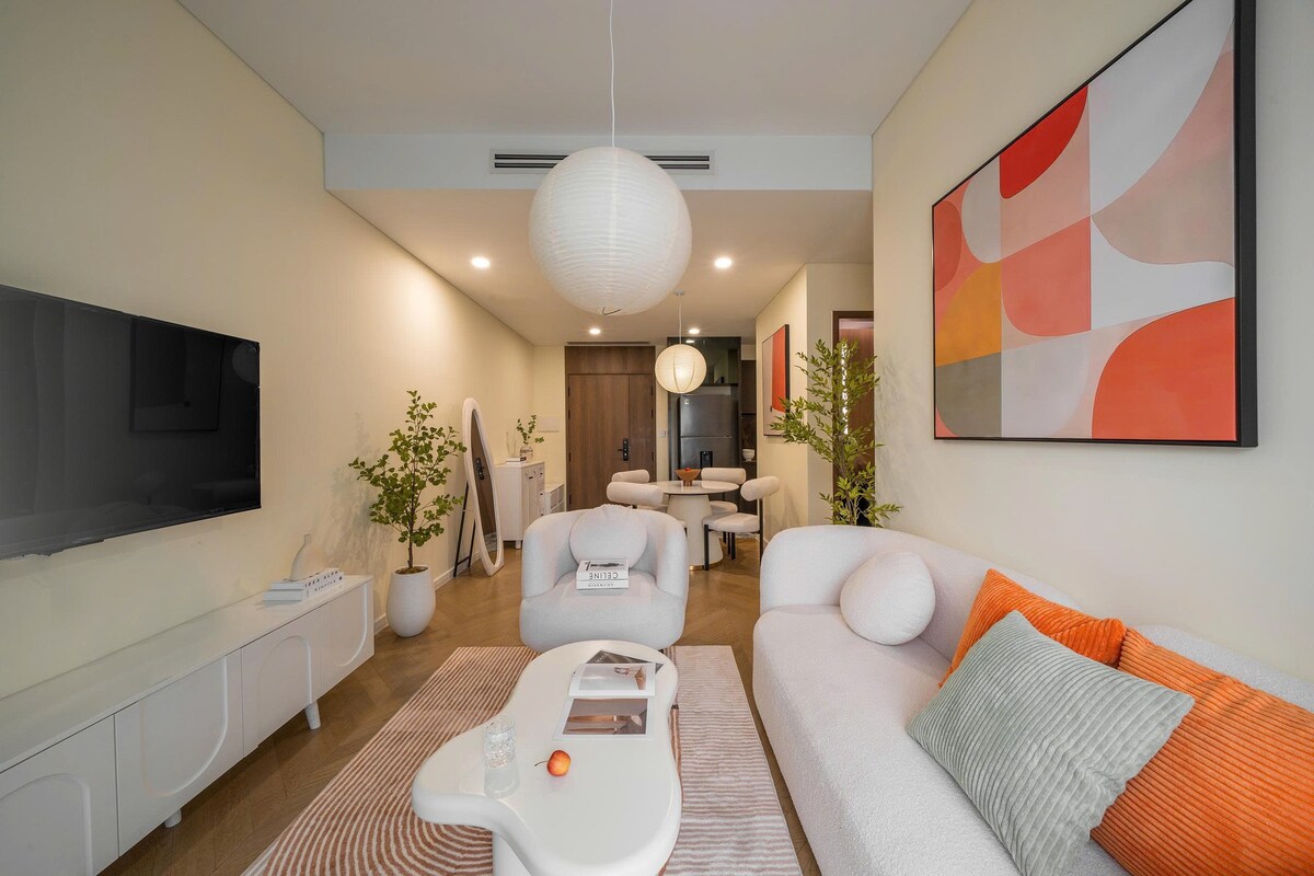O apartamento está lindamente decorado em estilo Wabi Sabi, localizado no piso superior do edifício LUMIÈRE à beira-rio, novo na Rua Tay Thao Dien, Distrito 2, estilo artístico. Tanto a janela do quarto como a varanda têm uma vista panorâmica de toda a cidade, a avenida da piscina. Um apartamento único com um belo espaço, há 1 grande sala de estar, 1 sala de jantar, 1 confortável sala de cozinha, 1 varanda de mesa de chá, 1 área de secagem de roupas, 2 casas de banho, 2 grandes quartos, para 6 pessoas para ficar, segurança de luxo, de alta classe.