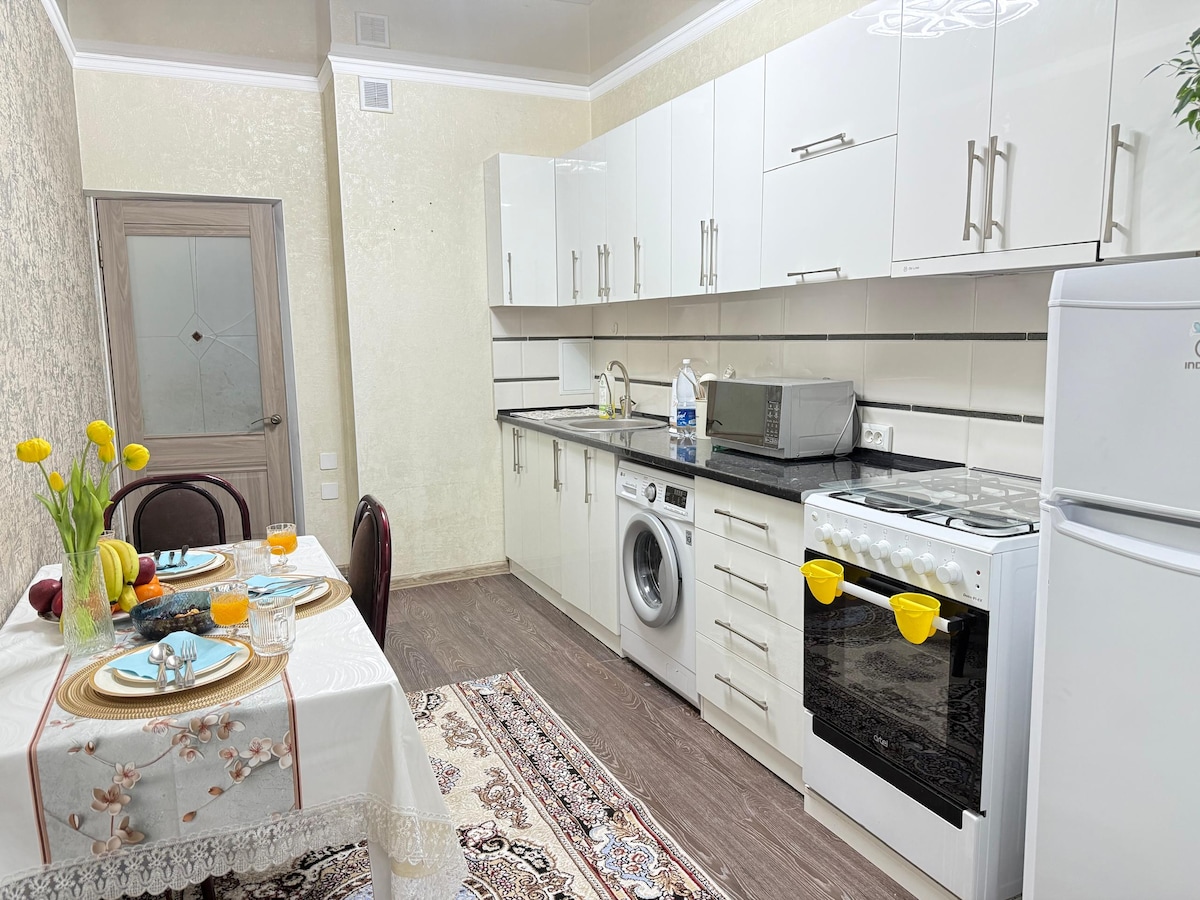 Apartamento moderno, luminoso e acolhedor no centro de Bisqueque, localizado num pátio verde tranquilo. Renovação recente, pisos de madeira natural, móveis novos e eletrodomésticos modernos criam uma atmosfera acolhedora como em casa. Um quarto com um roupeiro, uma área de estar e uma cozinha totalmente equipada. Colchão ortopédico, Wi-Fi rápido, TV cabo, ar condicionado e um espaço de trabalho confortável. Varanda aberta voltada para um quintal verde e uma galeria no lado oposto. Check-in autónomo através de um cofre seguro. Ideal para a sua estadia.