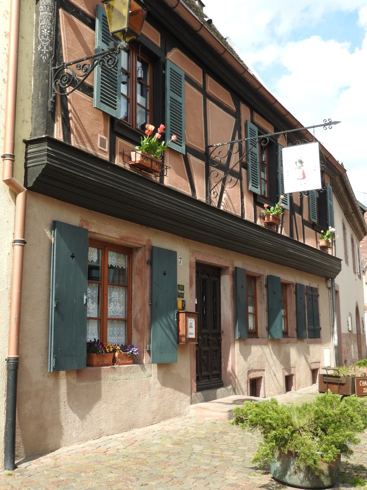 Iluminada pelo sol da manhã, a Casa de Cécile reflete a doçura da vida de outrora com seus ladrilhos encerados, sua cama tradicional da Alsácia e seus móveis antigos. Estúdio para 2 pessoas no térreo com kitchenette, sala de jantar, chuveiro e banheiro privativo com acesso a um belo pátio interno Nossa casa da Alsácia está localizada no coração da pequena vila vinícola de Kientzheim Kaysersberg, perto de Riquewihr, não muito longe de Colmar. Está localizado na Rota dos Vinhos da Alsácia e no sopé dos Vosges.