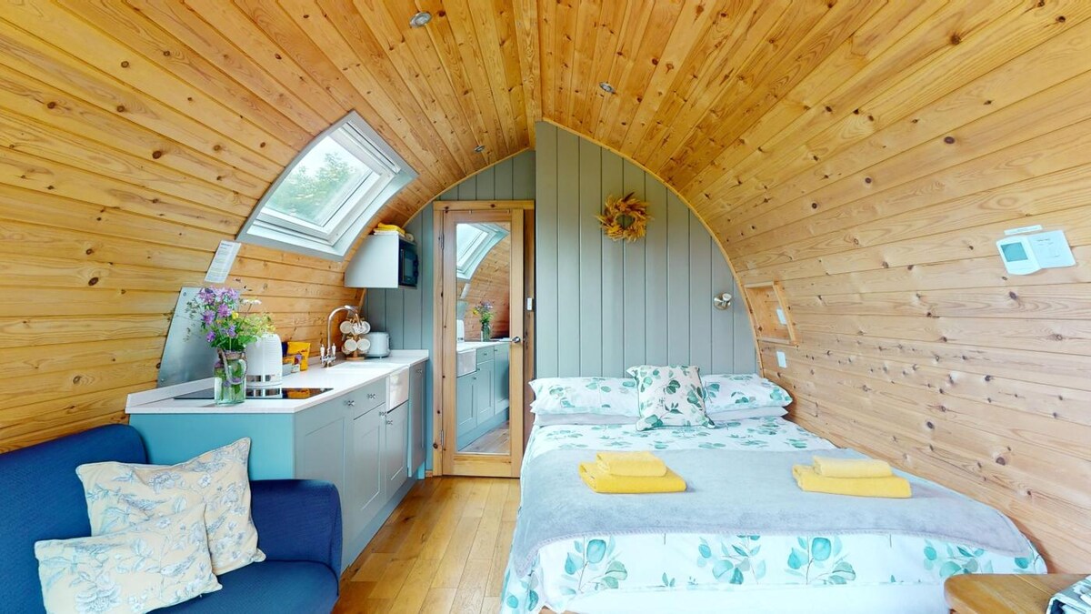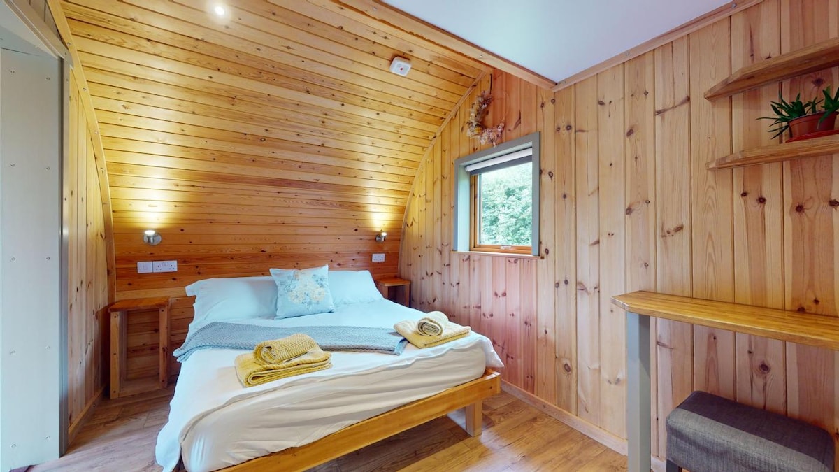 The Laurels offers the perfect escape for couples and friends seeking a relaxing retreat. Inside The Laurels, you’ll find a double bed dressed with soft, comfortable bedding, tastefully decorated, perfect to escape from everyday life. For small families, we can accommodate a third person while we don’t keep a futon in the pod, one can be arranged upon request. The wood-fired hot tub requires logs, kindling, and firelighters. Available for purchase on-site before 5 pm, this is not pre-lit.