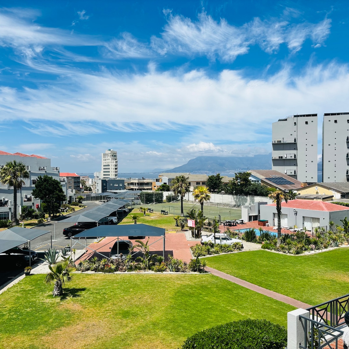 Modern, light studio apartment with secure open parking for two cars, a balcony and with uncapped wifi. Within 5 minutes walking distance of Blouberg beachfront promenade, popular with kite surfers from around the world. Enormous selection of restaurants, coffee shops, pubs and laundromats within walking distance. Various large shopping malls a few minutes’ drive away. Nice swimming pool in the complex. Part view of the sea and table mountain. Complex secured by electric fencing.