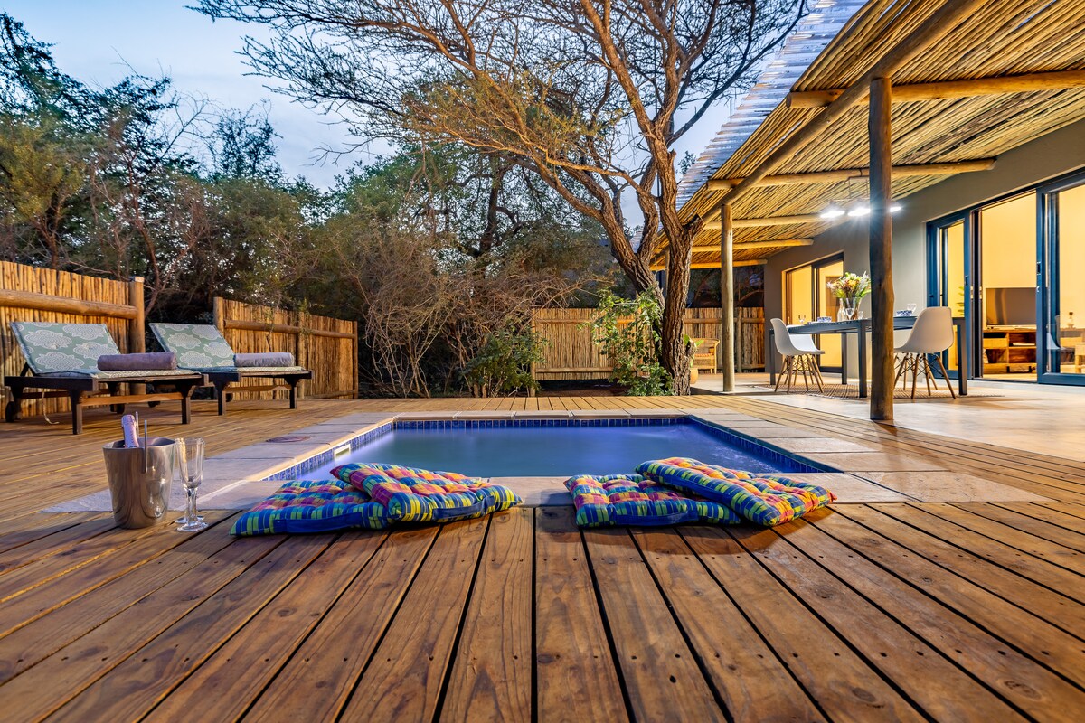 SOLAR, sem perda de carga ou quedas de energia. Durante o deslastre de carga, todas as luzes funcionam, Wi-Fi, ventilador de teto e geladeira, o fogão é a gás e o gêiser é a gás. Banhado com o calor e a cor do sol da tarde e no verdadeiro estilo africano, este luxuoso chalé com cozinha completa tem vista para a sua própria piscina privada e o incrível mato. A Hoedspruit Wildlife Estate está situada na pequena e pitoresca cidade de Hoedspruit, em Limpopo, África do Sul. OBSERVAÇÃO - NÃO SÃO PERMITIDAS FESTAS ou música na Wildlife Estate.