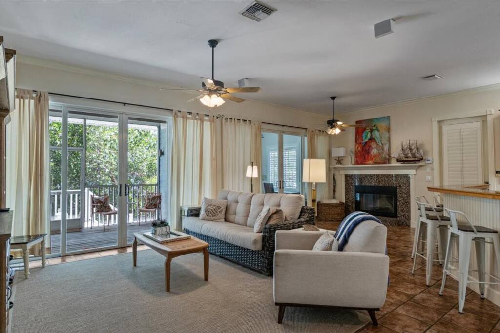 Estamos fora do caminho principal e é um lugar tranquilo para se reconectar com o que importa. Incentivamos nossos hóspedes a relaxar em nossa espaçosa e confortável varanda com tela com cadeiras, mesa e uma cadeira futon para cochilos. Use também o nosso grande chuveiro ao ar livre com labirinto privativo. Prepare-se para muito sol e diversão. Ao contrário da maioria dos aluguéis, o nosso inclui todos os produtos de papel, especiarias, artigos de plástico, produtos de higiene pessoal, café, chá, todos os lençóis, cadeiras de praia, macarrão, protetor solar, spray de insetos e CARRINHO DE GOLFE disponível para ALUGUEL durante a sua estadia.