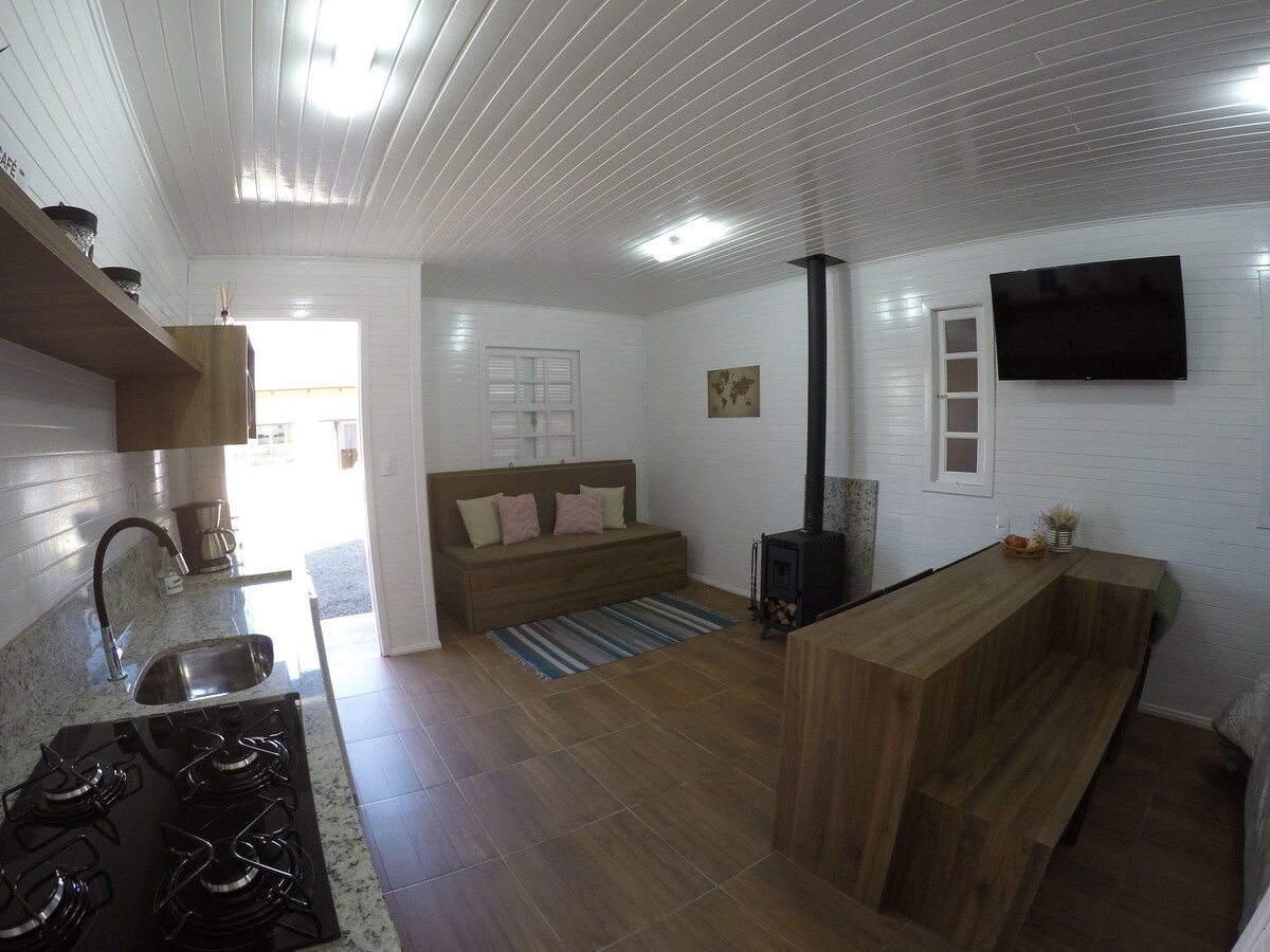 Os chalés contam com cozinha completa, sala com um sofá cama/casal, Tv Smart com NETFLIX e lareira, 01 banheiro e 02 quartos , o primeiro quartos com 01 cama de casal e o segundo quarto com 1 beliche. Disponibilizamos lenha, roupas de cama, toalhas de mesa e banho.
